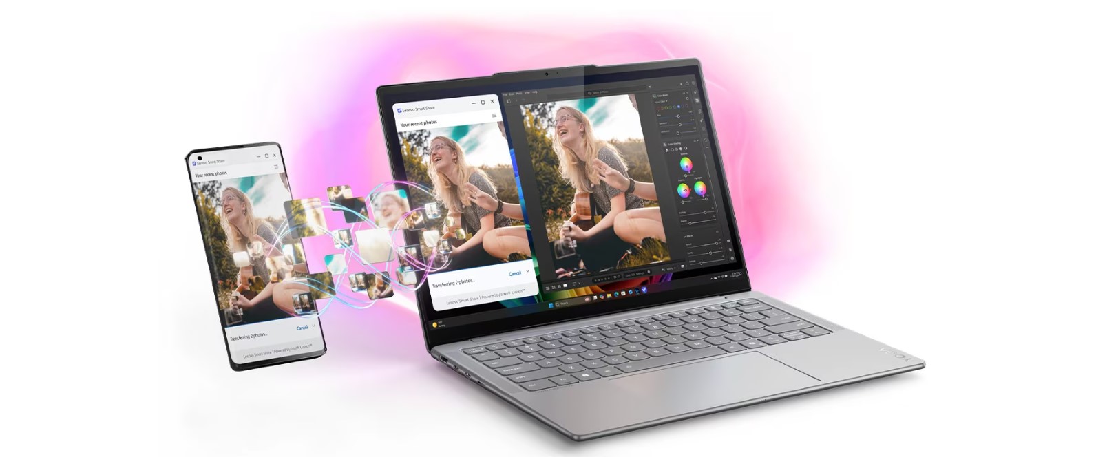 Funkce Smart Share okamĹľitÄ› propojĂ váš chytrĂ˝ telefon s notebookem prostĹ™ednictvĂm virtuálnĂho snĂmaÄŤe s umÄ›lou inteligencĂ. StaÄŤĂ klepnout na zaĹ™ĂzenĂ se systĂ©mem Android™ nebo iOS na notebooku a pak pĹ™etáhnout. Upravujte fotografie a snadno je sdĂlejte. NavĂc zĂskejte pĹ™Ăstup k textovĂ˝m zprávám a posĂlejte je z poÄŤĂtaÄŤe.