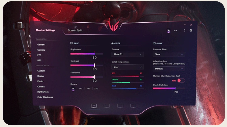 Hráči mohou pomocí funkcí On-Screen Display a OnScreen Control snadno přizpůsobit nastavení od úpravy základních možností monitoru až po registraci „klávesy definované uživatelem“, na kterou může uživatel nastavit klávesovou zkratku.