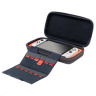 V tomto luxusním cestovním pouzdru s motivem závodní hry Mario Kart World můžete bezpečně a pohodlně přenášet nejenom novou herní konzoli Nintendo Switch 2, ale také herní konzoli Nintendo Switch nebo Switch – OLED Model. Ústředním prvkem tohoto pouzdra je nastavitelný stojánek, který při hraní umožňuje pohodlněji sledovat dění na obrazovce, zatímco při přepravě chrání obrazovku i analogové páčky konzole před poškozením. Na jeho vnitřní straně se navíc nachází dvanáct kapsiček pro uložení karet s vašimi oblíbenými hrami. Součástí balení jsou pak také dvě menší plastová pouzdra pro microSD karty.