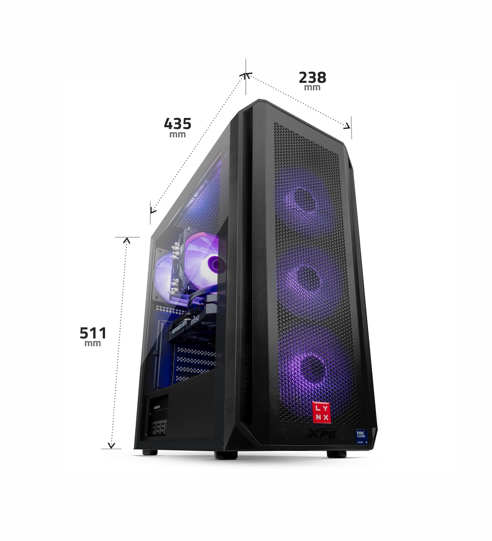 Základem sestavy je deska s čipovou sadou H810 osazená 10 jádrovým procesorem Intel Ultra 5, který disponuje technologií HyperThreading pro plynulejší multitasking, pracující na frekvenci 3.3 GHz, nebo až 4.9 GHz s technologií turbo. Paměti RAM značky Kingston jsou pro sestavy LYNX standardem, v této sestavě se jedná o paměti s kapacitou 16GB DDR5 (2x 8GB). Plynulý obrazový výstup je zajištěný grafickou kartou NVIDIA GeForce RTX 5060, která disponuje 8GB paměti GDDR7. V této sestavě nebrzdí ani uložiště je zde SSD disk 1 TB M.2 PCIe NVMe pro veškerá potřebná data a software. Dostatečné napájení zajištuje 550W zdroj. Sestava je dodávaná včetně nového operačního systému Windows 11 Home.