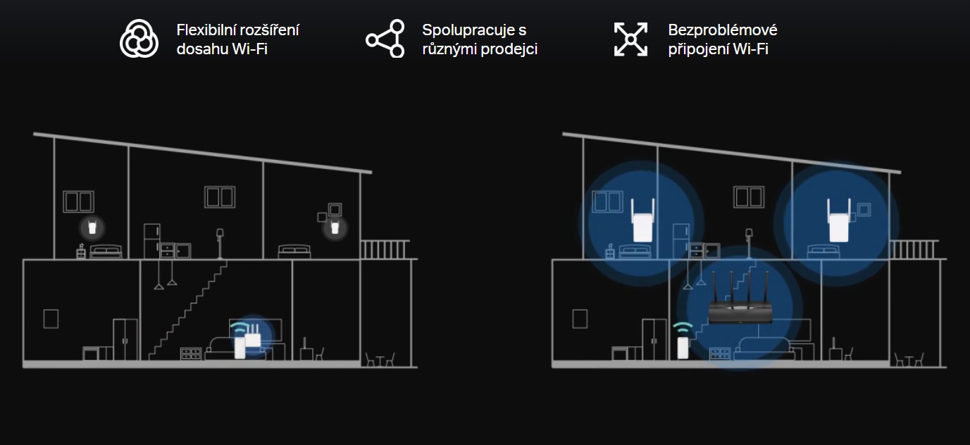 *Spolupracuje s routery EasyMesh a prodlužovači dosahu pro vytvoření bezproblémové sítě Mesh Wi-Fi pro celou domácnost, která zabraňuje pádům a zpožděním při přechodu mezi signály.