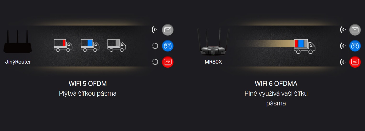 Streamujte obsah nebo hrajte hry na více zařízeních pro větší porci zábavy, ale ne na úkor snížení výkonu. MR80X podporuje technologie OFDMA a MU-MIMO1, které posilují vaši Wi-Fi síť tím, že umožňují více klientům přenášet data současně. Výsledkem je čtyřikrát větší kapacita a efektivita sítě na místech s vysokou hustotou uživatelů.