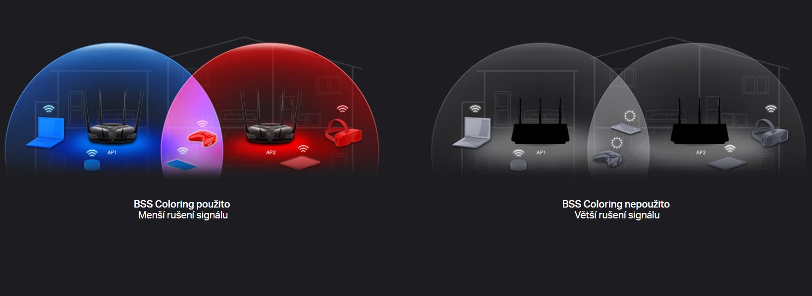 *SNÍŽENÉ RUŠENÍ Wi-Fi – minimalizuje rušení způsobené signálem sousedních sítí a zlepšuje efektivitu datových přenosů s technologií BSS Coloring.