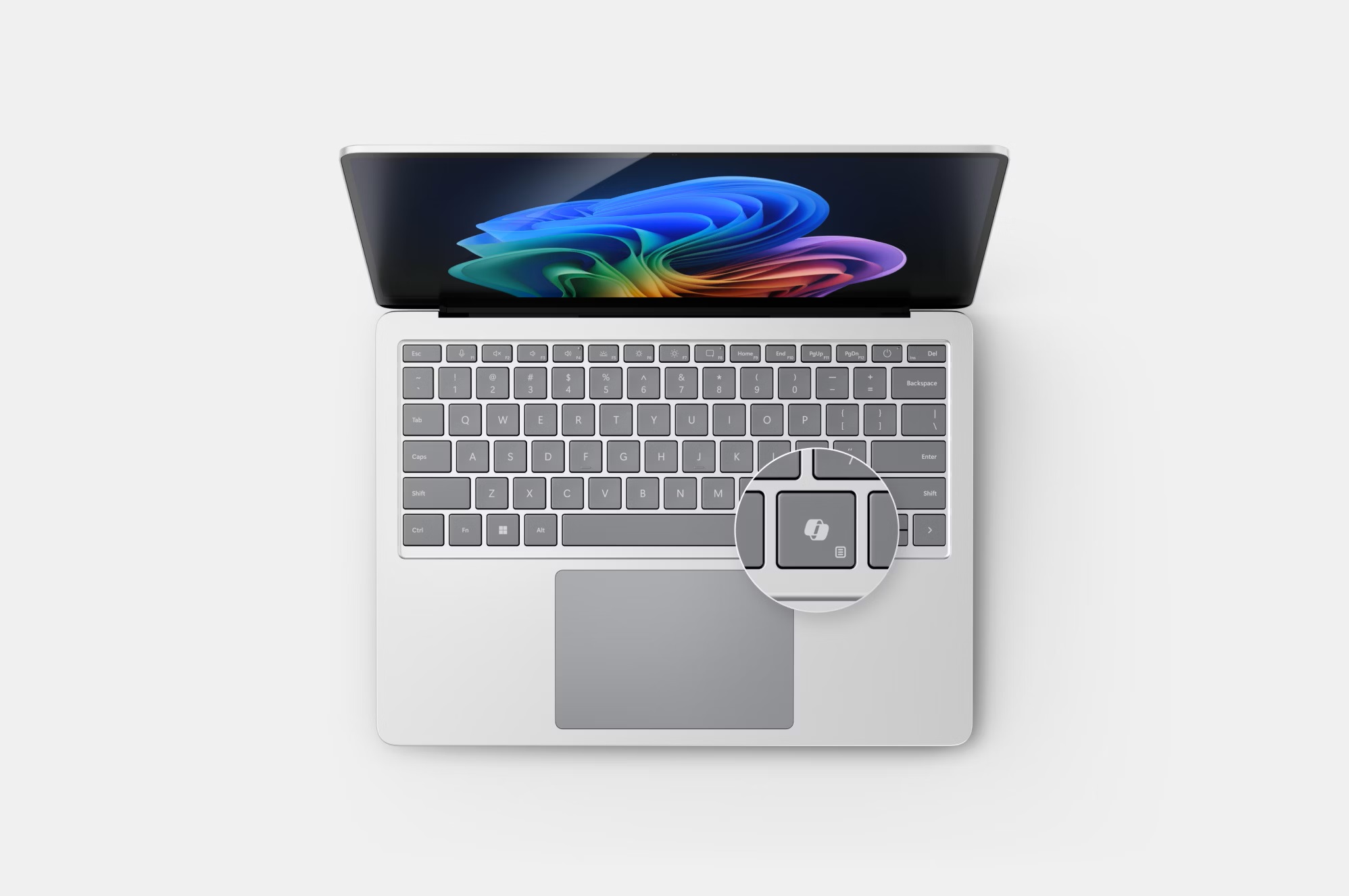 Klávesnice: posvícená, celý řádek funkčních kláves (F1-F12), klávesy Copilot, Windows a speciální tlačítka pro ovládání médií, jasu obrazovky