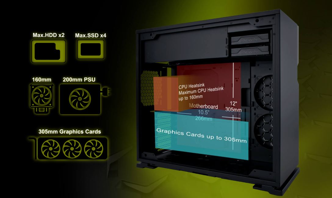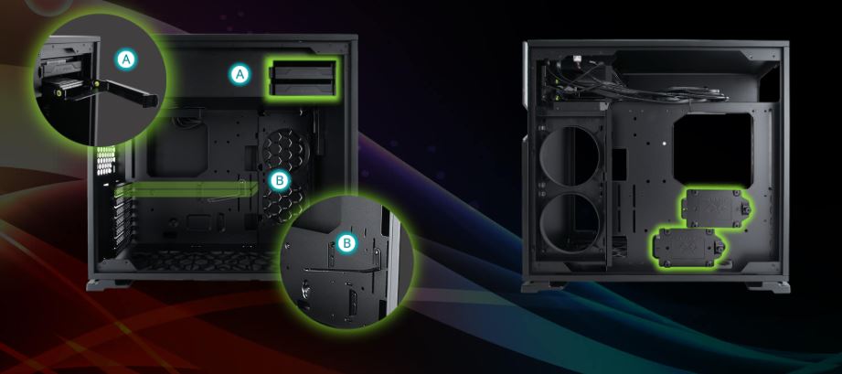 Model 101C podporuje nejen 2,5„ a 3,5“ pozice pro disky, ale také je vybaven speciálním držákem GPU, který poskytuje grafické kartě dodatečnou oporu. Navíc jsou na zadní straně přihrádky pro základní desku chytře umístěny dva držáky pro 2,5" SSD disky, které využívají vnitřní prostor.