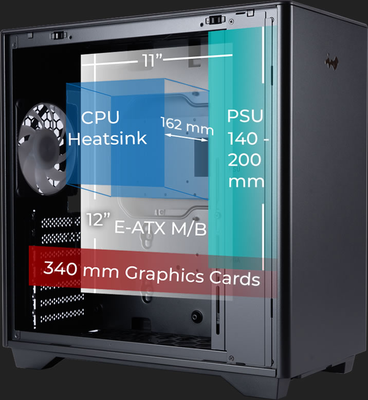 Podporuje základní desky: 12" x 11" E-ATX, ATX, Micro-ATX, Mini-ITX