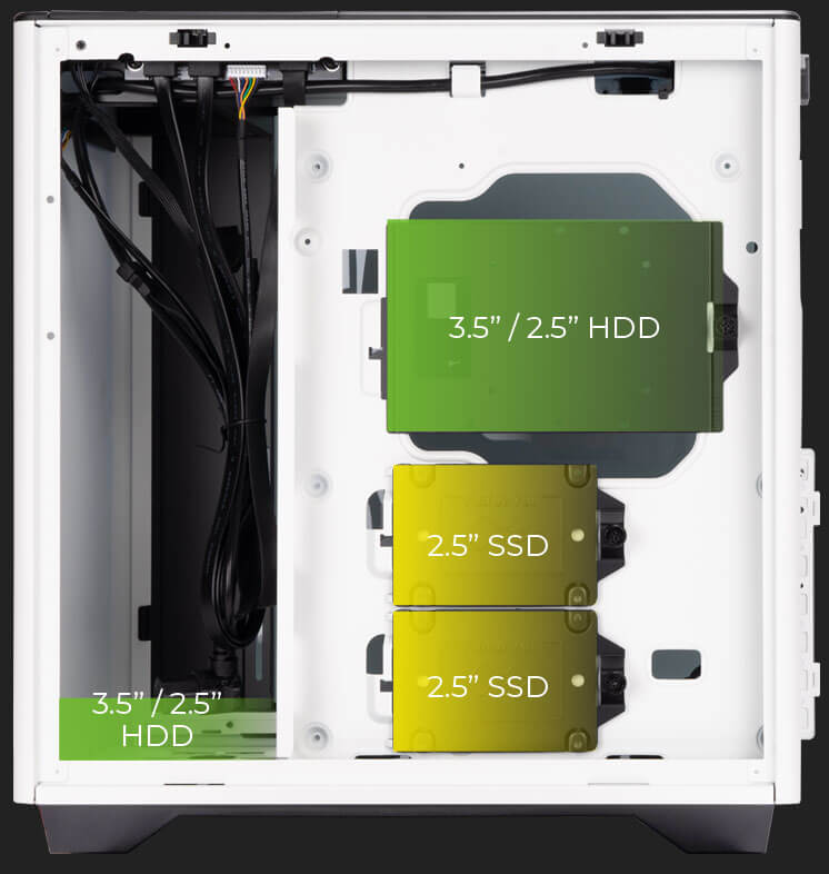 A5 podporuje více 2,5" / 3,5" úložných zařízení. SkříŠnabízí strategicky umístěné kanály za přihrádkou základní desky pro čistou a snadnou správu kabelů.