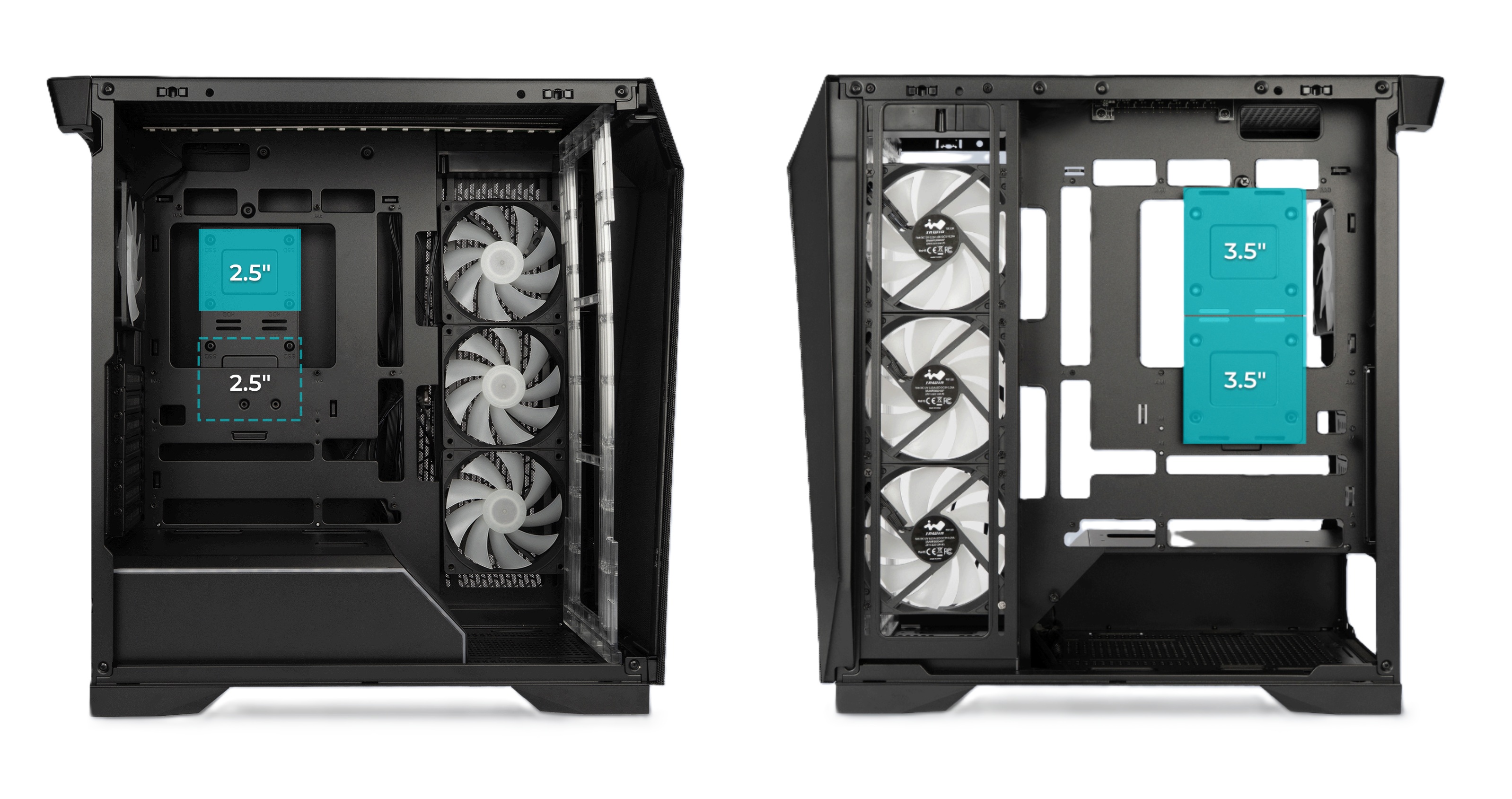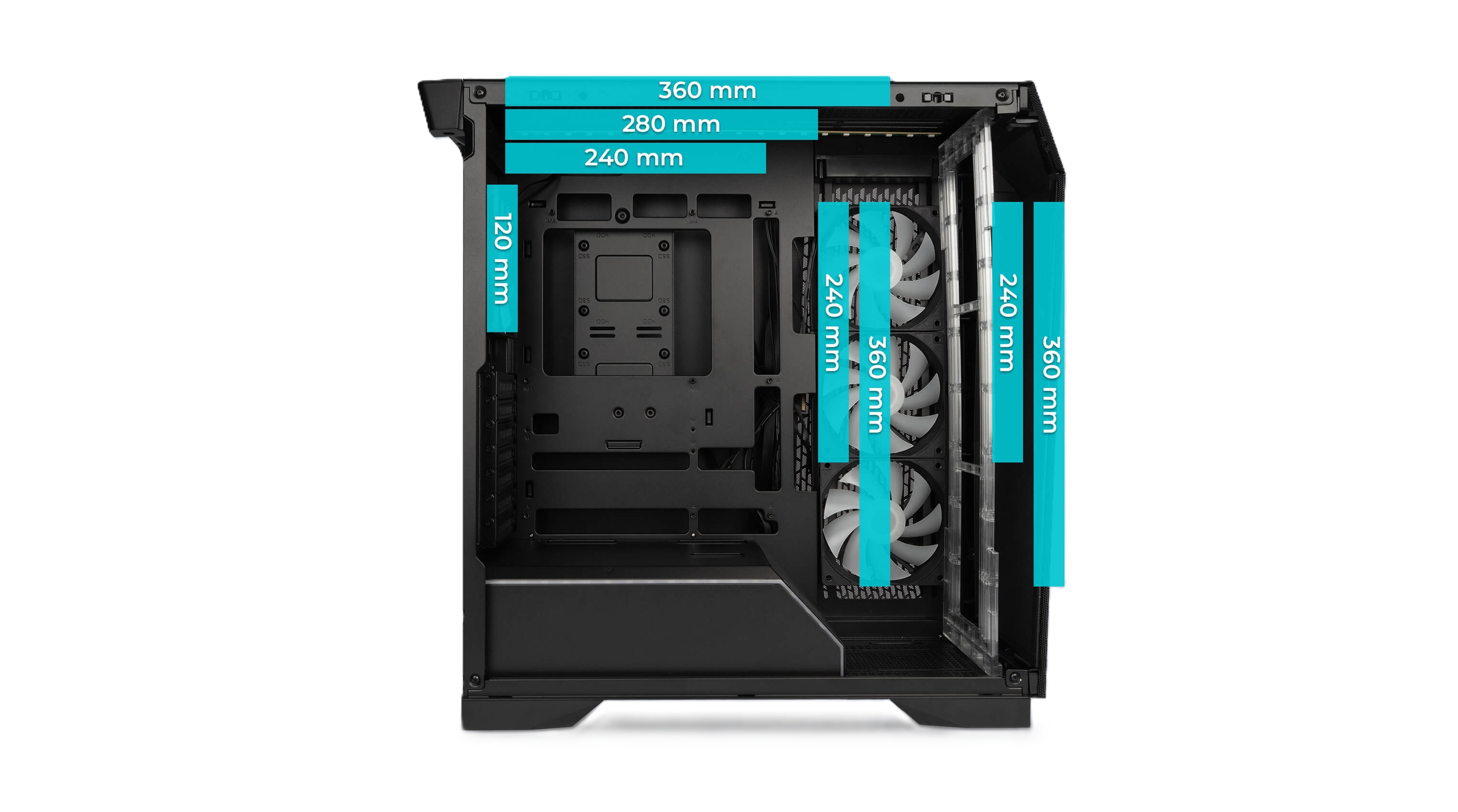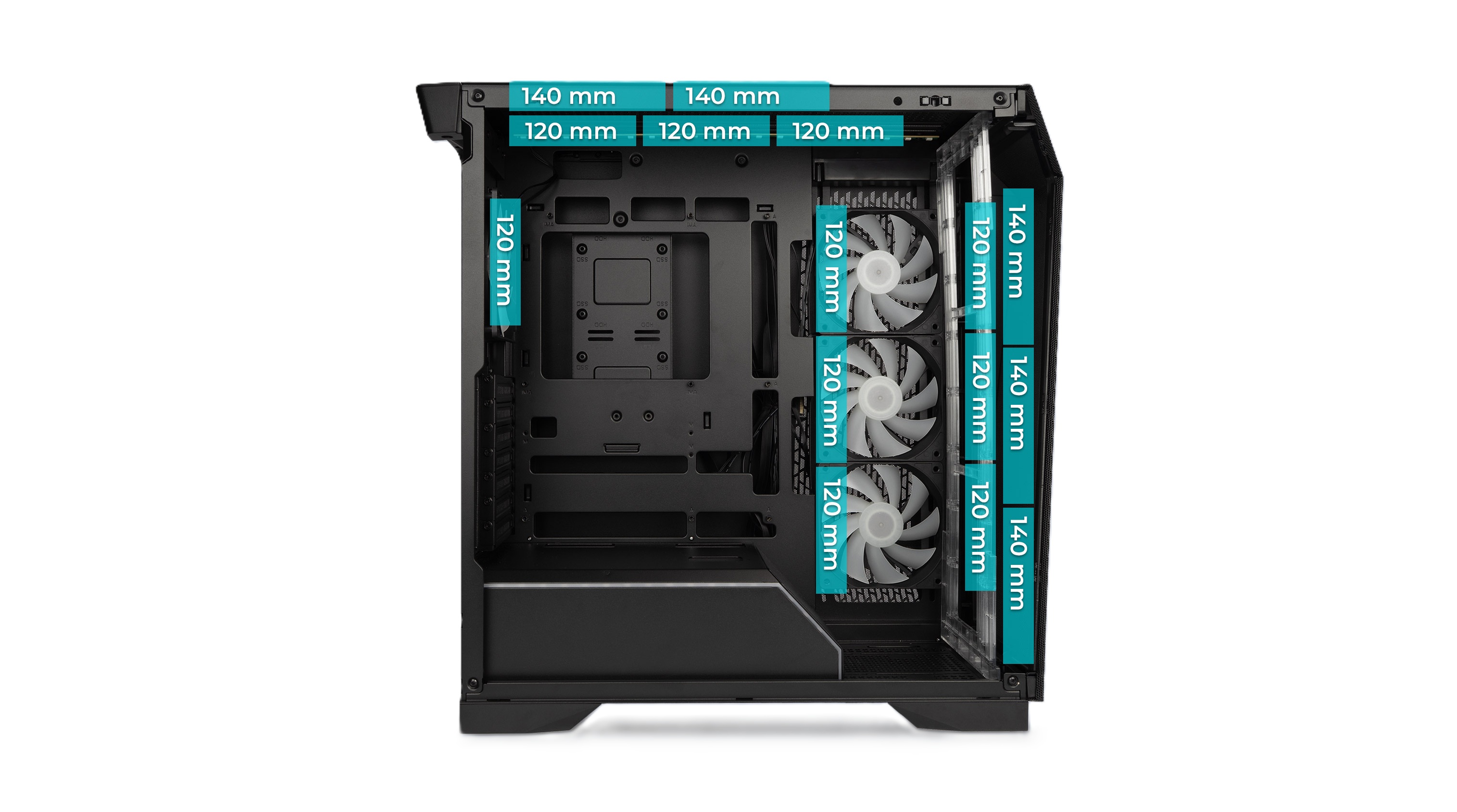 * Pojme až 11 ventilátorů a 240/280/360 mm radiátorů