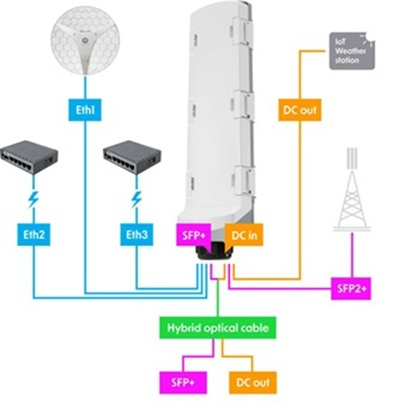 Řešení pro náročné venkovní instalace, kde je potřeba rozdělit data a napájení z jednoho hybridního kabelu na více zařízení. Switch GPERx6 kombinuje 3 Gigabit Ethernet porty s PoE funkcionalitou, 3 vysokorychlostní 10G SFP+ porty pro optické spoje a 3 DC výstupy pro napájení IoT zařízení nebo specializovaných přístrojů.