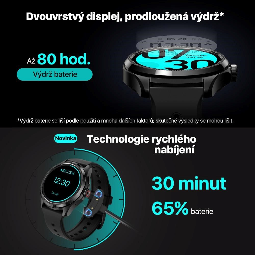Technologie Dual Display od společnosti Mobvoi používá dva displeje. Základem je skvělý AMOLED displej, nad ním je druhý úsporný displej. To umožňuje plynulé přepínání mezi základním a chytrým režimem a díky tomu hodinky poskytují výrazně delší výdrž na baterii.