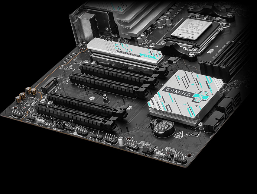 - Frozr Guard: RozšĂĹ™enĂ˝ chladiÄŤ, tepelnĂ© podloĹľky MOSFET s vĂ˝konem 7 W/mK, pĹ™ĂdavnĂ© tepelnĂ© podloĹľky s tlumivkou a EZ M.2 Shield Frozr II jsou vytvoĹ™eny pro vysokĂ˝ vĂ˝kon systĂ©mu a nepĹ™etrĹľitĂ˝ provoz