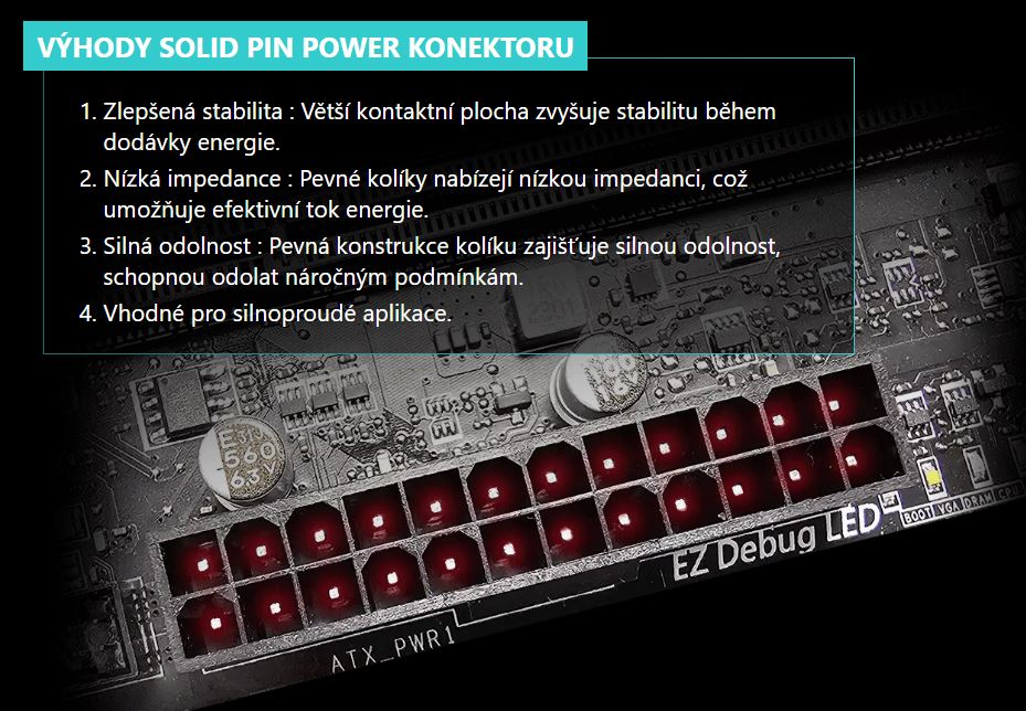 8pinovĂ© a 24pinovĂ© napájecĂ konektory základnĂch desek MSI jsou všechny navrĹľeny s pevnĂ˝mi kolĂky. Konstrukce s pevnĂ˝m kolĂkem umoĹľĹuje stabilnÄ›jšà pĹ™enos vĂ˝konu 12 V do CPU, a to i pĹ™i manipulaci s vysokĂ˝mi proudovĂ˝mi zátěžemi.