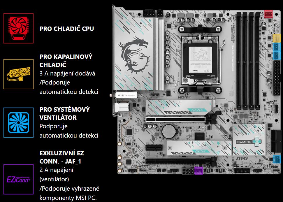 PĹ™ipojte a synchronizujte chladiÄŤe a skĹ™ĂnÄ› MSI pomocĂ strategicky umĂstÄ›nĂ˝ch pinovĂ˝ch konektorĹŻ, vÄŤetnÄ› speciálnĂho konektoru pro ÄŤerpadlo a ventilátor.
