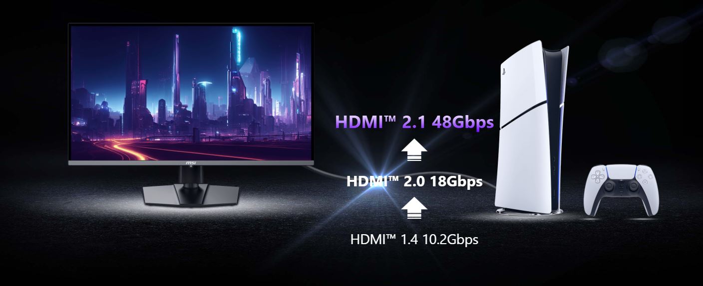 HDMI™ 2.1 poskytuje plnou šĂĹ™ku pásma aĹľ 48 Gb/s a podporuje VRR a ALLM pro plynulejšà hranĂ her na konzoli s nĂzkou latencĂ aĹľ 120 Hz. DĂky integrovanĂ© technologii HDMI™ CEC (Consumer Electronics Control) mĹŻĹľe monitor komunikovat s ovladaÄŤi, coĹľ jim umoĹľĹuje monitor probudit a pĹ™izpĹŻsobit reĹľimy rĹŻznĂ˝m zaĹ™ĂzenĂm.