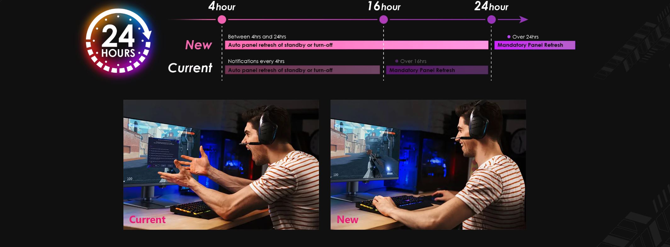 Cyklus aktualizace panelu byl prodlouĹľen z 16 na 24 hodin, coĹľ sniĹľuje pĹ™erušenĂ bÄ›hem hranĂ her nebo práce. UĹľivatelĂ© uvidĂ pĹ™ipomenutĂ pouze 30 minut pĹ™ed aktualizacĂ, coĹľ zajišťuje minimálnĂ pĹ™erušenĂ. Aktualizace se stále aktivuje automaticky, kdyĹľ monitor pĹ™ejde do pohotovostnĂho reĹľimu nebo se vypne, ÄŤĂmĹľ se zachová plná ochrana OLED bez narušenĂ vašeho zážitku.
