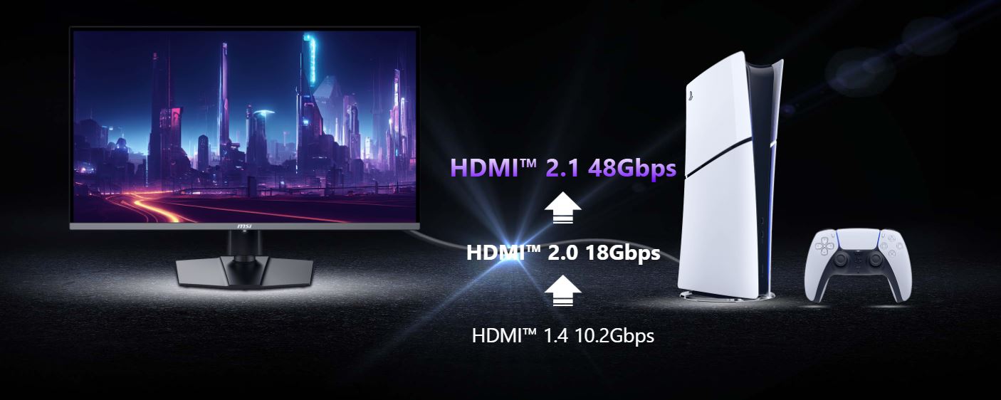 HDMI™ 2.1 poskytuje plnou šířku pásma až 48 Gb/s a podporuje VRR a ALLM pro plynulejší hraní her na konzoli s nízkou latencí až 120 Hz. Díky integrované technologii HDMI™ CEC (Consumer Electronics Control) může monitor komunikovat s ovladači, což jim umožňuje monitor probudit a přizpůsobit režimy různým zařízením.