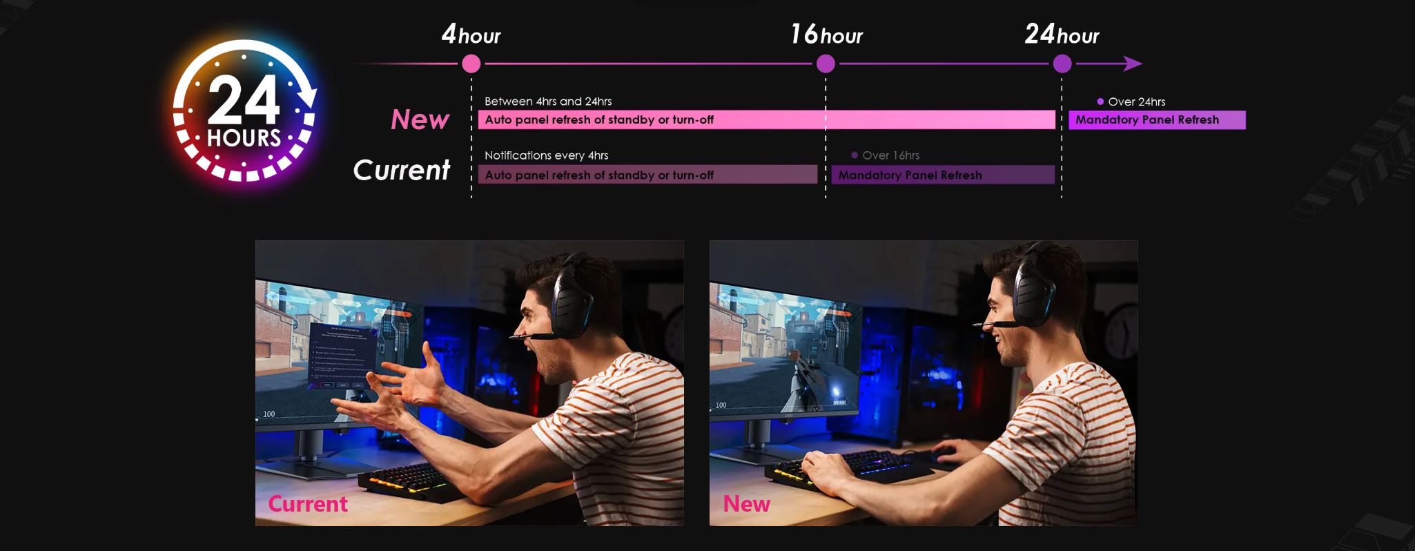 Cyklus obnovování panelu byl prodloužen z 16 na 24 hodin, což snižuje přerušení během hraní her nebo práce. Uživatelé uvidí připomenutí pouze 30 minut před obnovením, což zajišťuje minimální narušení. Obnovení se stále aktivuje automaticky, když monitor přejde do pohotovostního režimu nebo se vypne, čímž se zachová plná ochrana OLED bez narušení vašeho zážitku.