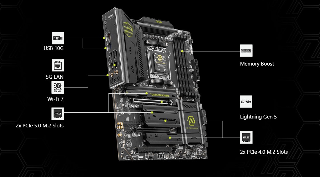 ObrovskĂ˝ krok ke zvýšenĂ vĂ˝konu pamÄ›tĂ DDR s nejnovÄ›jšà pamÄ›tĂ DDR5. V kombinaci se speciálnĂm svaĹ™ovacĂm procesem SMT a technologiĂ MSI Memory Boost je MAG B850 TOMAHAWK MAX WIFI pĹ™ipravena poskytnout prvotĹ™ĂdnĂ vĂ˝kon pamÄ›ti.