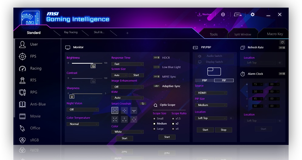 Pomocí aplikace Gaming Intelligence APP je nastavení herního monitoru velmi snadné. Nemusíte používat tlačítka na monitoru a procházet všemi nabídkami, k nastavení monitoru stačí použít klávesnici a myš. Aplikace vám dokonce nabízí možnosti klávesových zkratek, takže můžete snadno přepínat nastavení mezi různými hrami.