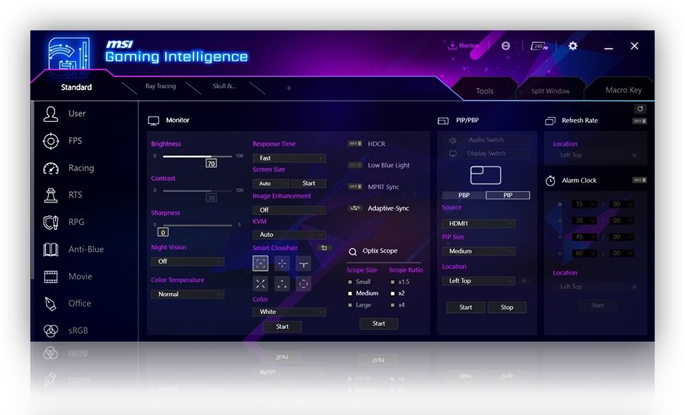 Pomocí aplikace Gaming Intelligence APP je nastavení herního monitoru velmi snadné. Nemusíte používat tlačítka na monitoru a procházet všemi nabídkami, k nastavení monitoru stačí použít klávesnici a myš. Aplikace vám dokonce nabízí možnosti klávesových zkratek, takže můžete snadno přepínat nastavení mezi různými hrami.