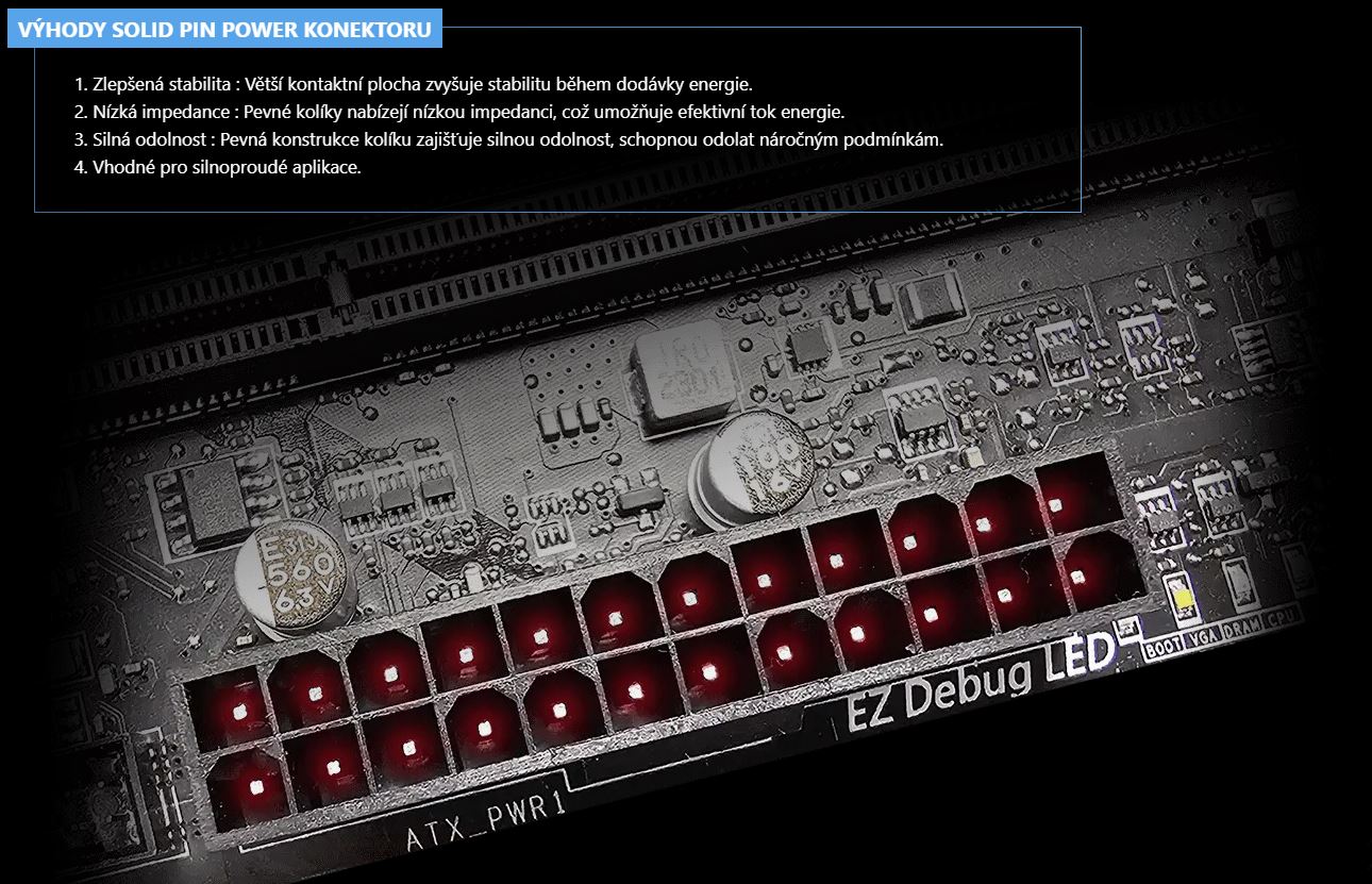 8pinovĂ© a 24pinovĂ© napájecĂ konektory základnĂch desek MSI jsou všechny navrĹľeny s pevnĂ˝mi kolĂky. Konstrukce s pevnĂ˝m kolĂkem umoĹľĹuje stabilnÄ›jšà pĹ™enos vĂ˝konu 12 V do CPU, a to i pĹ™i manipulaci s vysokĂ˝mi proudovĂ˝mi zátěžemi.