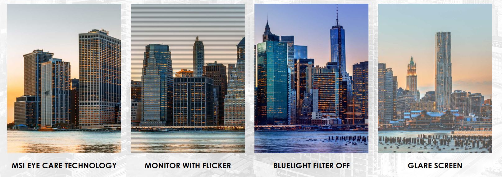 MSI Eye Care: technologie proti blikání + technologie pro snížení modrého světla + displej s ochranou proti oslnění