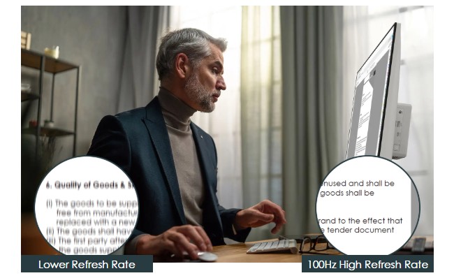 Bezchybný průběh, žádné zasekávání. Zúčastněte se nejplynulejší online konferenční hovoru a ukažte zákazníkům perfektní reklamní video s obnovovací frekvencí 100 Hz. Výzkum společnosti VESA ukazuje, že pro 95 % uživatelů se obnovovací frekvence 85 Hz stala de facto standardem pro běžné použití, který zobrazuje „neblikající“ obrázky.