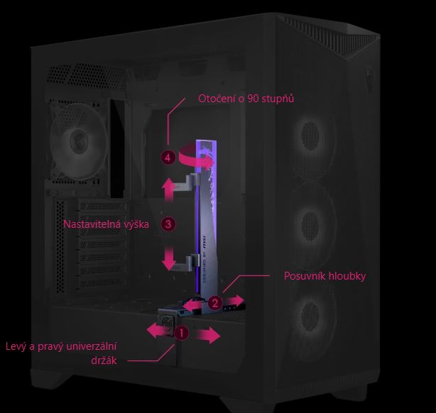 Stojan pro grafickĂ© karty lze snadno nastavit pro rĹŻznĂ© velikosti grafickĂ˝ch karet a zpĹŻsoby instalace bez pouĹľitĂ jakĂ©hokoli nářadĂ, coĹľ z nÄ›j ÄŤinĂ konstrukci vhodnou pro nadšence, která umoĹľĹuje snadnou zmÄ›nu optimálnĂ podpĹŻrnĂ© polohy.
