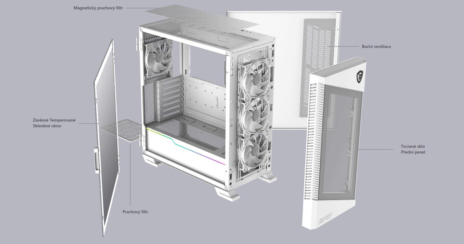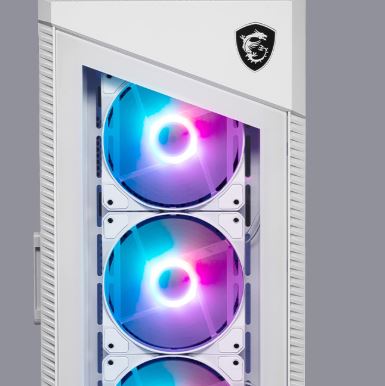 Přednà panel MPG VELOX 100R WHITE je vyroben z tvrzeného skla, které bez jakýchkoli překážek jasně ukazuje osvětlenà ARGB ventilátorů.