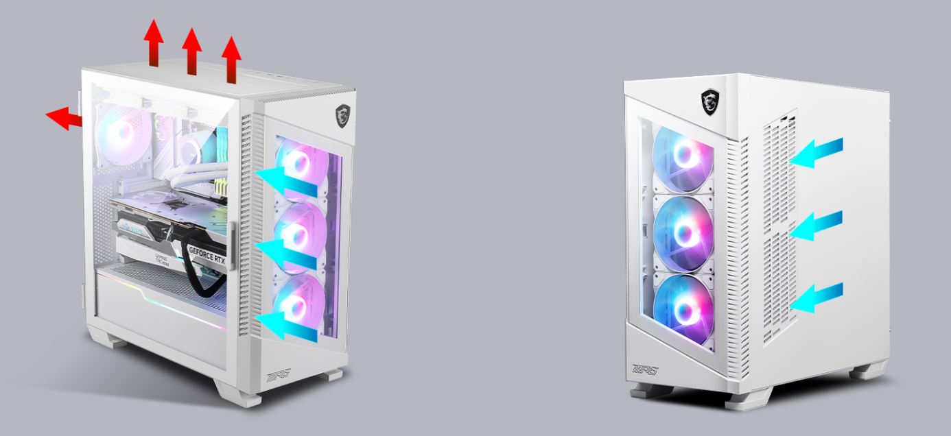 Ĺada MPG VELOX 100 je vybavena boÄŤnĂmi ventilaÄŤnĂmi otvory, kterĂ© podporujĂ aĹľ 2 ventilátory / 240mm radiátor.