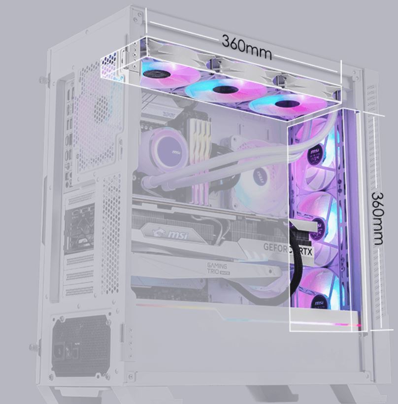 SĂ©rie MPG VELOX 100 poskytuje vynikajĂcĂ prostor pro komponenty a umoĹľĹuje instalaci 1 chladiÄŤe 360 mm/3 ventilátorĹŻ 120 mm na hornĂ i pĹ™ednĂ stranÄ›.