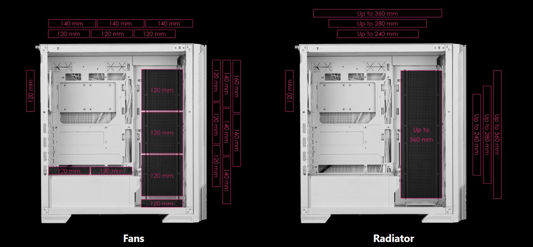 Tato skĹ™ĂĹ PC je navrĹľena pro vynikajĂcĂ chlazenĂ s pĹ™edinstalovanĂ˝mi ventilátory Dual Layer Blades – dva vpĹ™edu a jeden vzadu – kterĂ© zajišťujĂ optimálnĂ proudÄ›nĂ vzduchu.