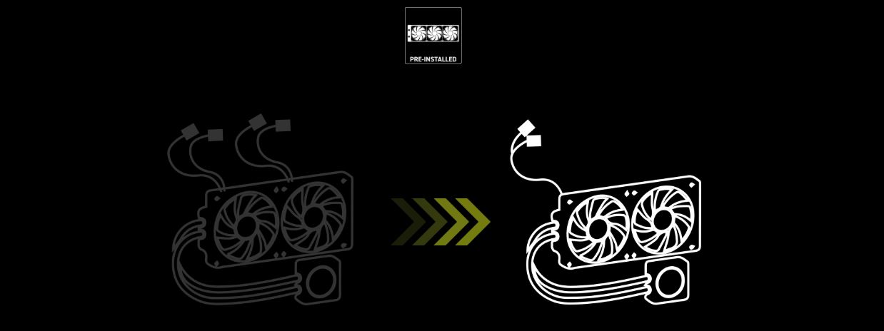 Dříve vodní chlazení od 240mm vyžadovalo uspořádání alespoň čtyř kabelů. Nyní jsou ventilátory nejen předinstalovány, ale také se zjednodušil čas potřebný k uspořádání kabelů na pouhý jeden kabel. To zvyšuje uživatelskou přívětivost, snižuje zátěž při instalaci a zvyšuje potěšení z montáže.