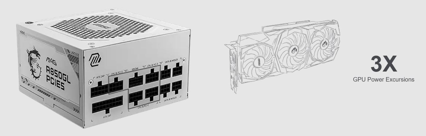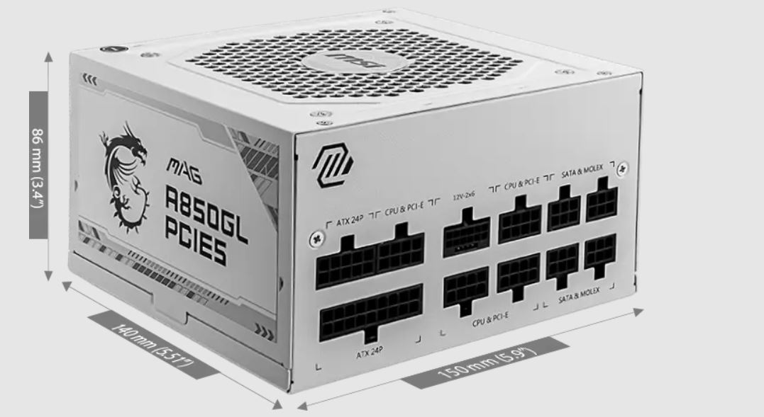 Je vybaven vĂ˝stupnĂm portem, kterĂ˝ je kompatibilnĂ s PCIe 5.1 a Intel PSDG (Power Supply Design Guide) ATX 3.1. NapájecĂ zdroj MAG A850GL PCIE5 WHITE navĂc zvládne aĹľ dvojnásobnĂ© vĂ˝kyvy celkovĂ©ho vĂ˝konu a trojnásobnĂ© vĂ˝kyvy vĂ˝konu GPU.