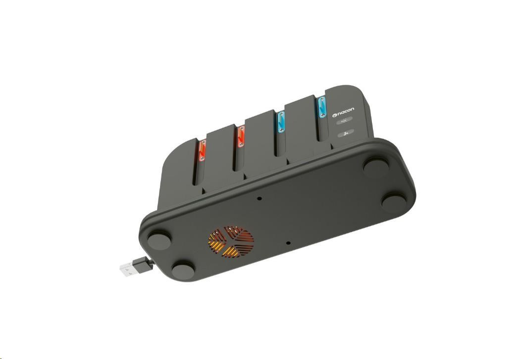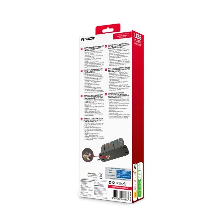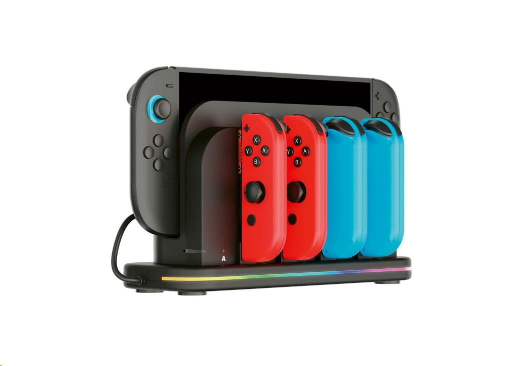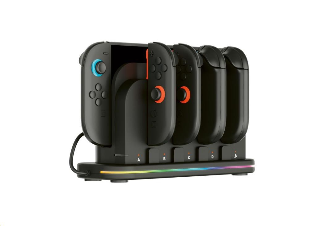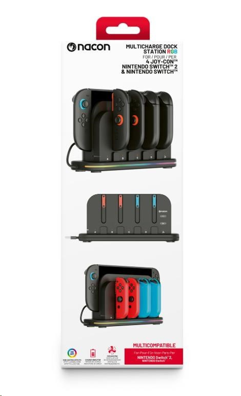 Tato nabíjecí dokovací stanice od společnosti Nacon přijde vhod všem majitelům nové herní konzole Nintendo Switch 2 i původní herní konzole Nintendo Switch, kteří často potřebují nabíjet větší počet ovladačů Joy-Con. Stanice umožňuje nabíjet současně až čtyři ovladače, jakož i samotnou konzoli, jejímuž přehřátí zabraňuje zabudovaný chladicí větráček. O stavu nabíjení každého z ovladačů informuje příslušný LED ukazatel, zatímco RGB proužek s výběrem z devíti různých efektů dodává stanici stylový, moderní vzhled. Protože napájecí USB-C kabel není součástí balení, slouží k připojení stanice do elektrické sítě originální napájecí příslušenství dodávané s konzolí.