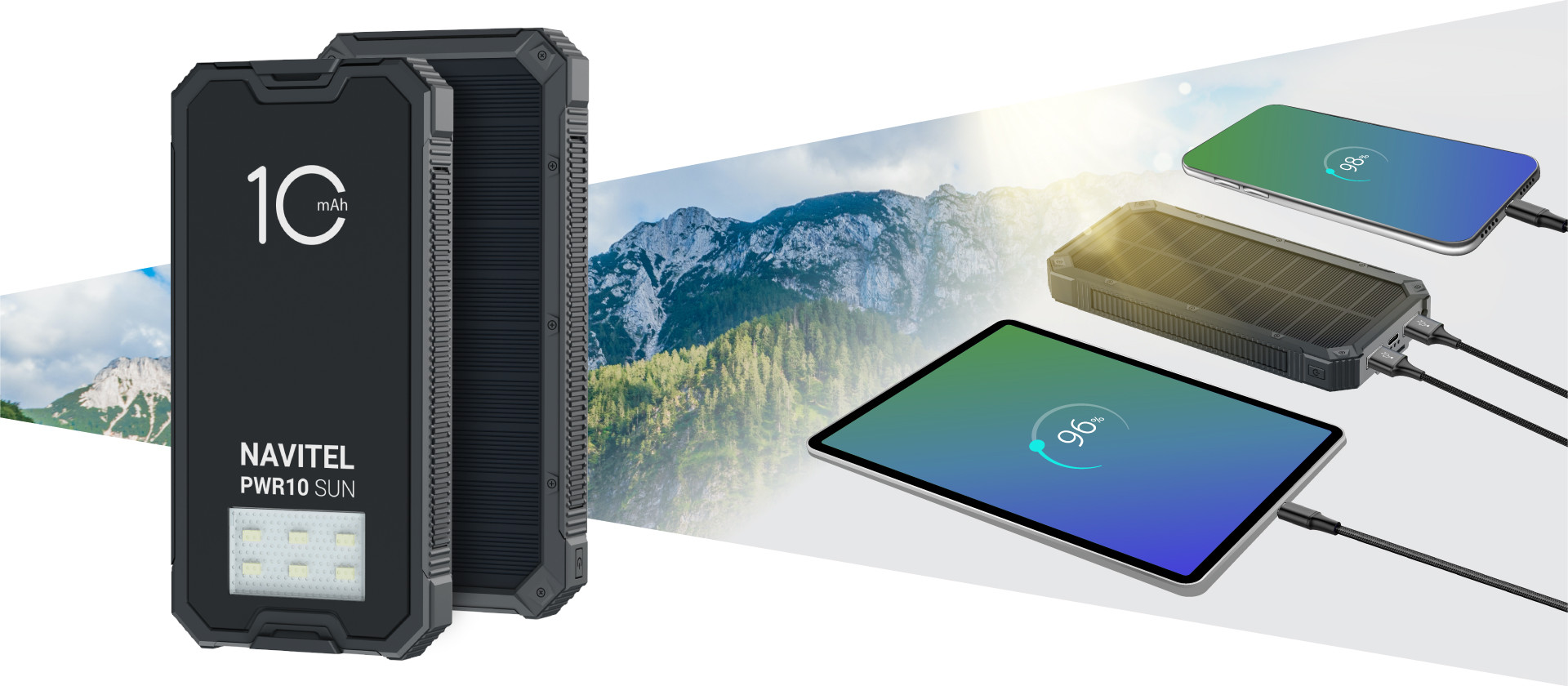 NAVITEL PWR10 SUN je pĹ™enosná baterie s kapacitou 10000mAh s vyztuĹľenĂ˝m tÄ›lem a nĂzkou hmotnostĂ, vybavená kompaktnĂm solárnĂm panelem. 2 vestavÄ›nĂ© USB-A vĂ˝stupy a 2-cestnĂ˝ USB-C port umoĹľĹujĂ nabĂjet nÄ›kolik zaĹ™ĂzenĂ souÄŤasnÄ›. NAVITEL PWR10 SUN je kompatibilnĂ se všemi mobilnĂmi telefony a dalšĂm elektronickĂ˝m zaĹ™ĂzenĂm.