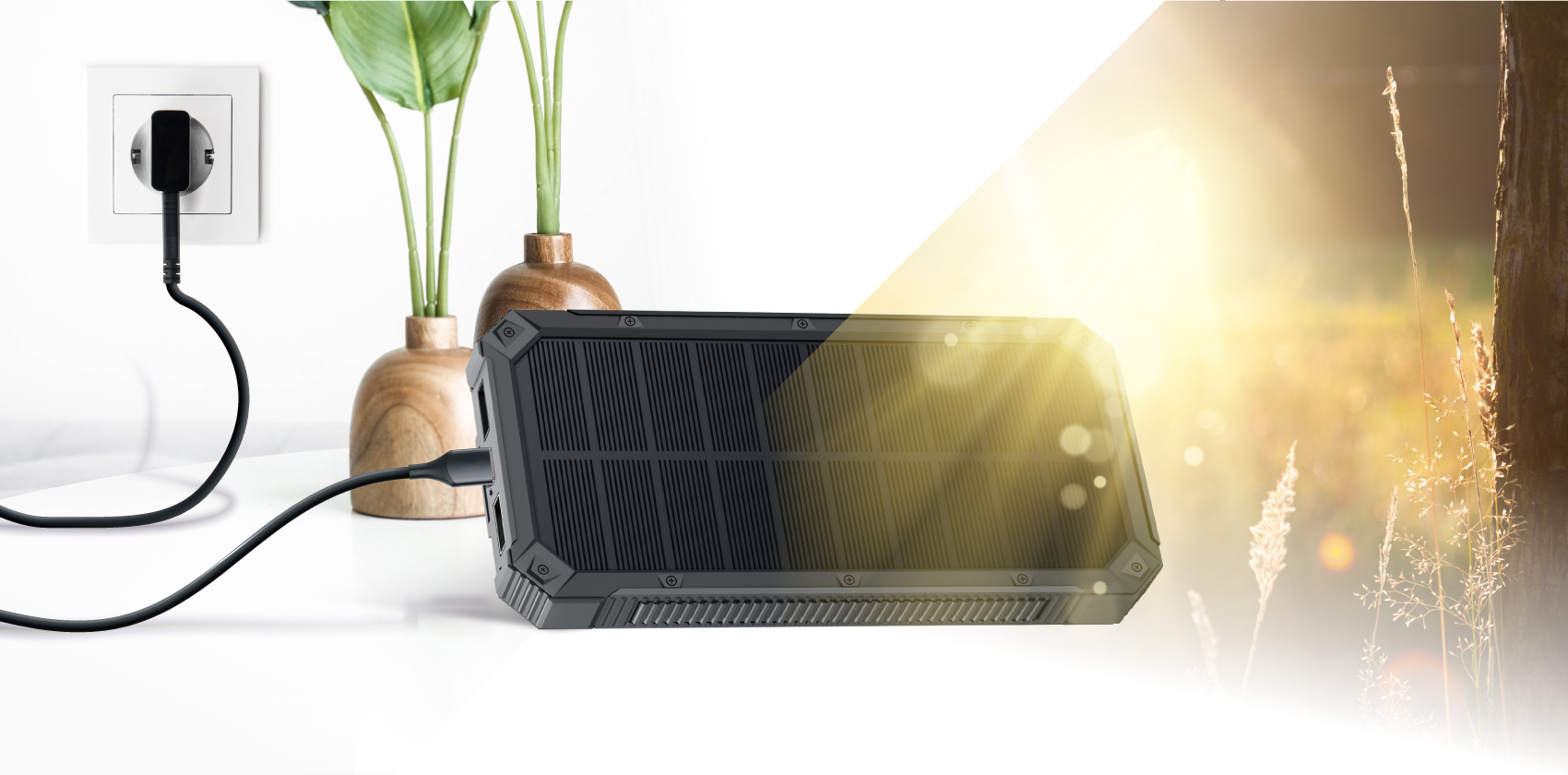 zařízení lze nabíjet nejen ze slunečního záření, ale také ze zásuvky. 4 LED indikátory vám pomohou kontrolovat zbývající úroveň nabití zařízení.