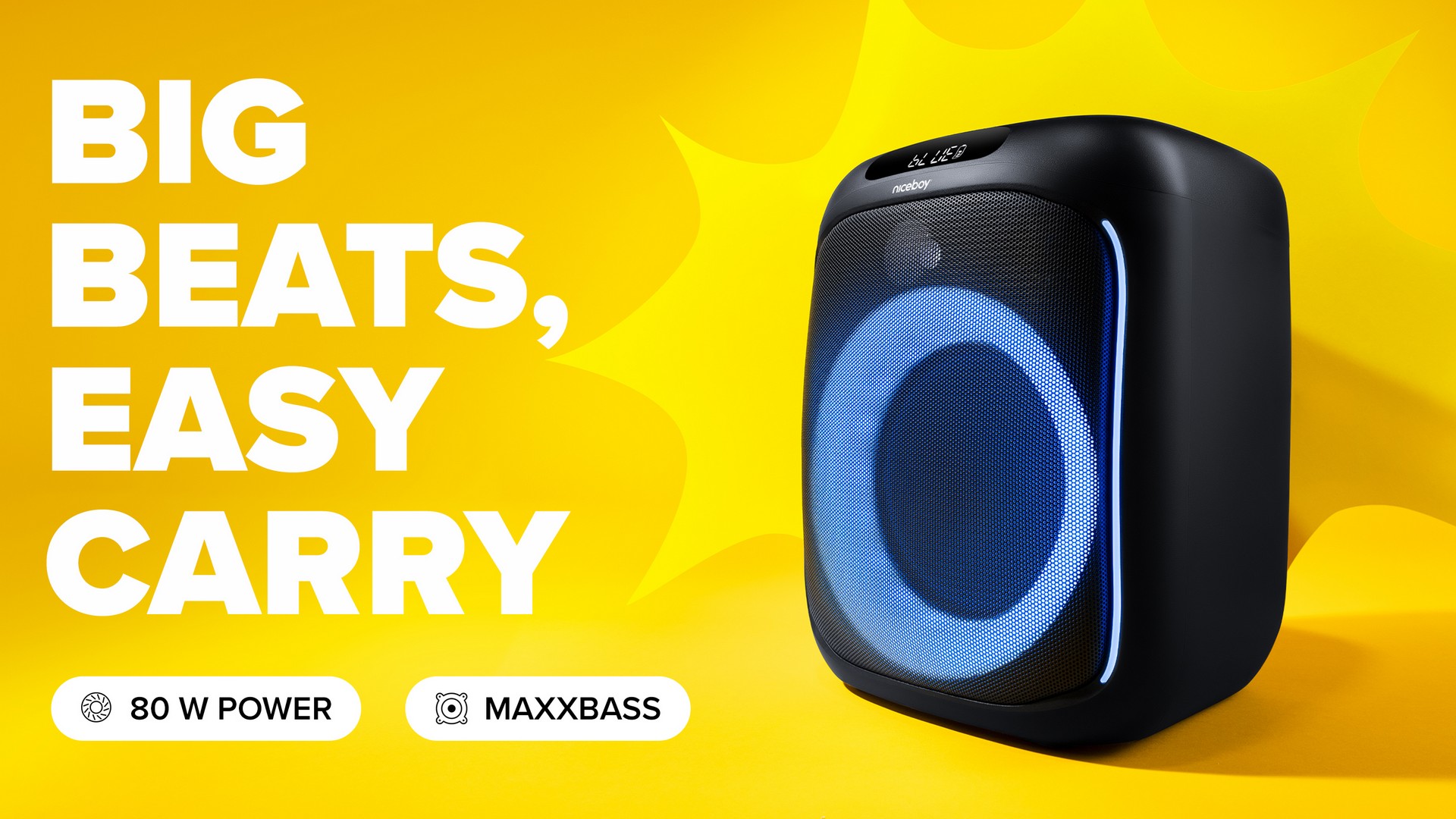 Niceboy PARTY Boom 80W vás překvapí svým kvalitním a hlavně silným zvukem, který byste u tak kompaktního stroje nečekali. I když jde o přenosný party reproduktor, jeho 6,5“ basovy´ reproduktor a 1,5“ vy´sˇkovy´ reproduktor s výkonem 80 W RMS doslova rozjede jakoukoliv akci, ať už jste na pláži, na grilovačce, zkrátka kdekoliv. Díky inovativní technologii MaxxBass si můžete vychutnat ohromující basový a zároveň krystalicky čistý zvuk, kde každá píseň zní plná energie a života.