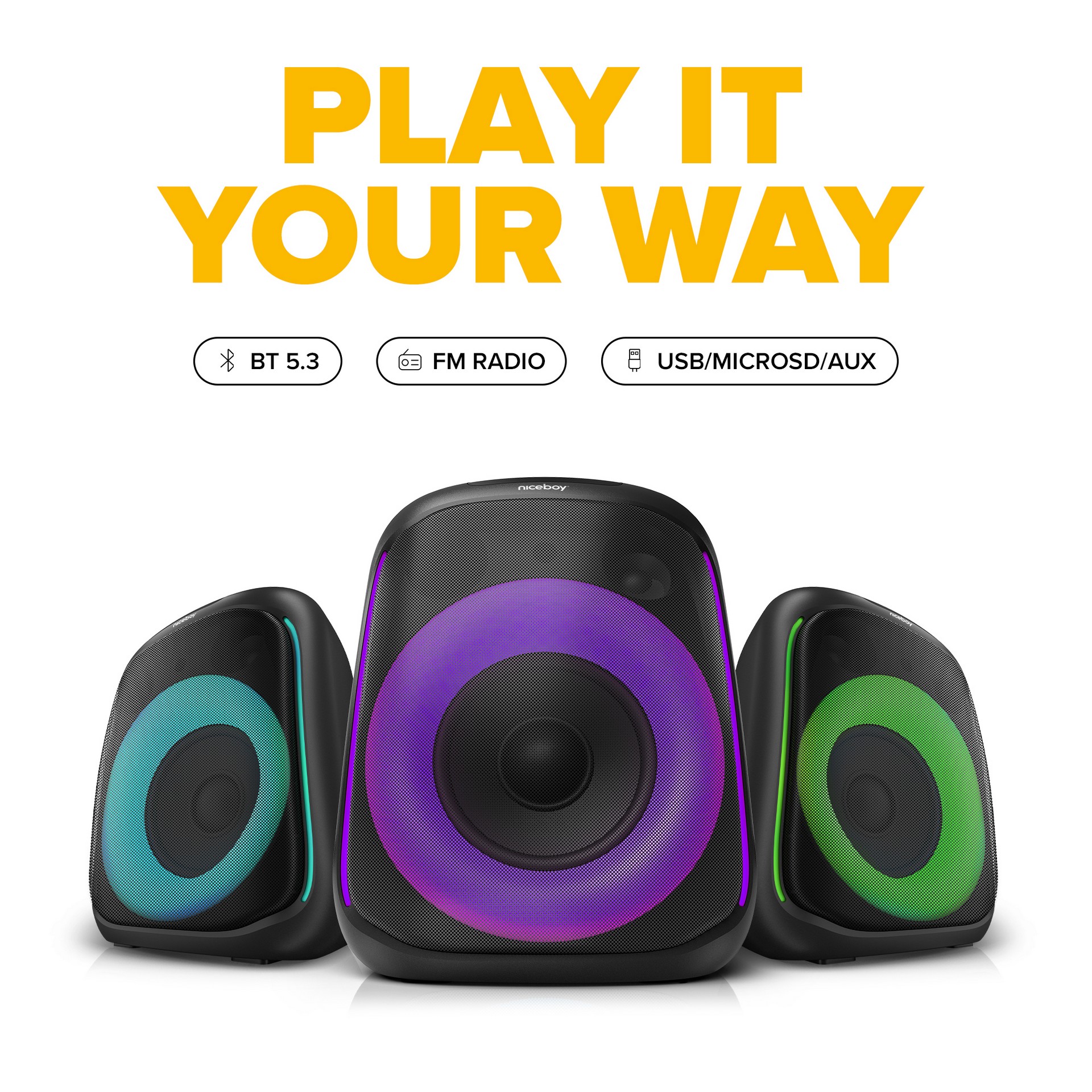 S Niceboy PARTY Boom 80W se vám otevírá svět hudby bez hranic. Bezstarostně streamujte své oblíbené playlisty přímo ze svého telefonu pomocí technologie BT 5.3. A pokud máte svou oblíbenou hudbu uloženou na USB disku nebo microSD kartě, nebojte se, protože Niceboy PARTY Boom 80W zvládne vše. A až vás přestane bavit vlastní hudba, přepněte na FM rádio a objevujte nové hudební světy. Užijte si svou hudbu, jak chcete a kdy chcete.