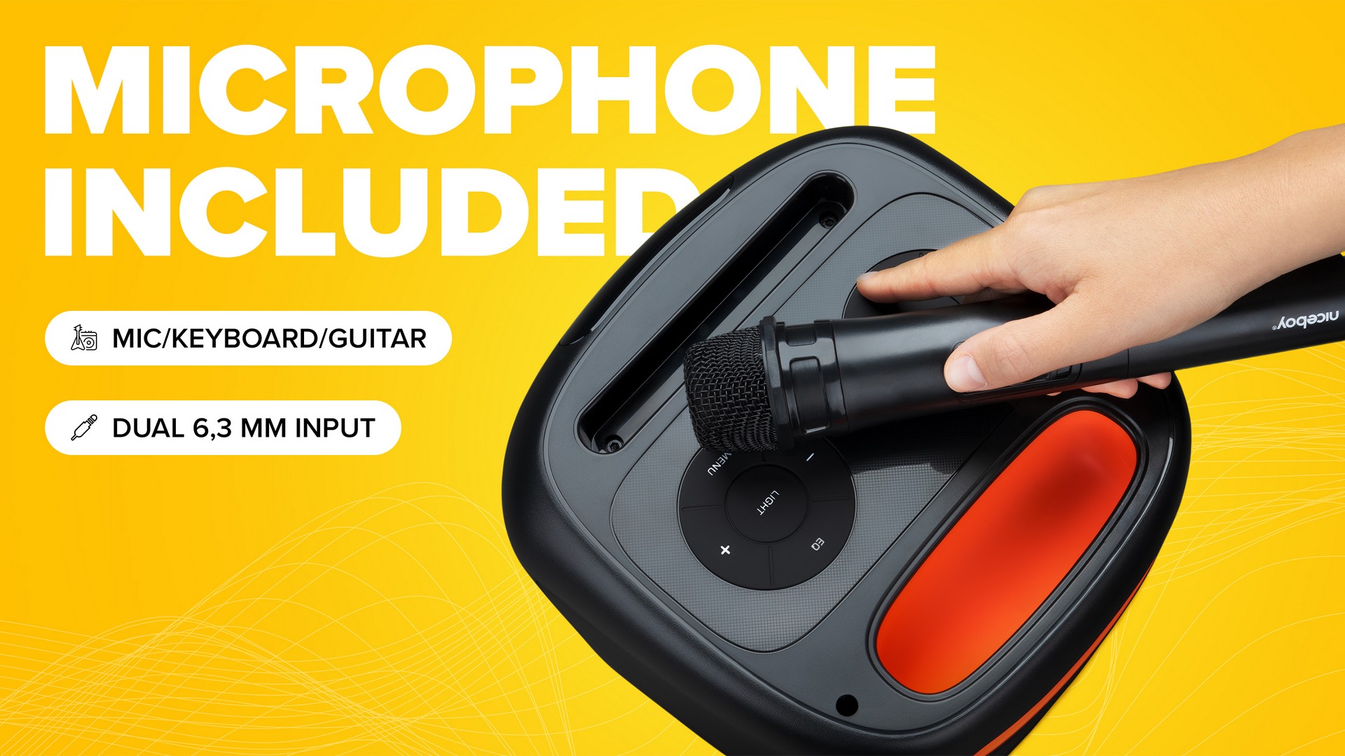 Užívejte si ještě více zábavy s Niceboy PARTY Boom 80W! S bezdrátovým mikrofonem a dvěma 6,3 mm jack konektory pro připojení dalších nástrojů umí tento reproduktor více než jen přehrávání hudby. Připojte se s přáteli, odhalte svůj talent a udělejte si vlastní hudební show! Ty nejlepší momenty si nahrajte na microSD kartu nebo USB disk a vytvářejte tak nezapomenutelné okamžiky. Svět hudby s Niceboy PARTY Boom 80W, to je vaše vlastní pódium, vaše vlastní zábava!