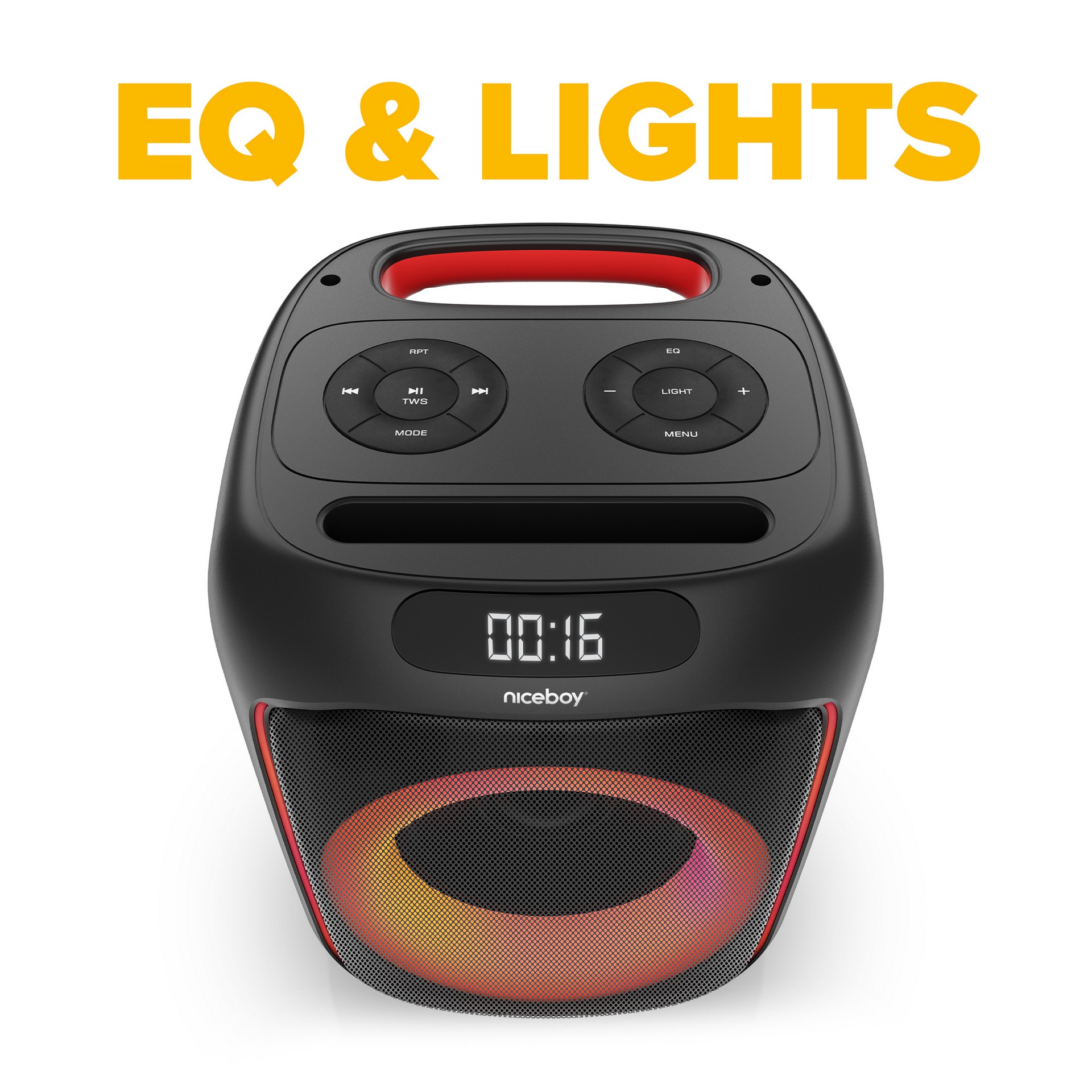 Nechte zvuk zaznít podle svého! S vestavěným ekvalizérem, přednastavenými styly a možností ručního nastavení výšek, basů a dokonce i echo efektu, budete moct vyladit zvuk přesně podle vašeho vkusu. A to není vše – rozsviťte párty světelnými efekty podle své nálady. Každý beat bude nejen slyšet, ale i vidět. Tvořte atmosféru a dejte vašim akcím úplně nový nádech. Niceboy PARTY Boom 80W, to je audiovizuální zážitek, který ohromí vaše smysly.