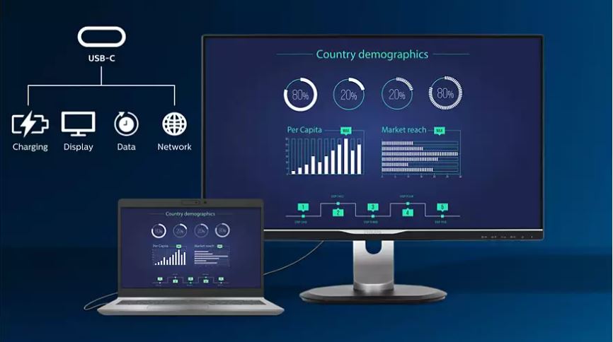 Monitor Philips USB-C nahrazuje změť kabelů. Sledujte obraz FHD a současně nabíjejte notebook pomocí jediného kabelu USB-C. Funkce jako uzavřený cyklus pro sestavu více displejů a funkce pro pohodlí očí s certifikací TUV šetří vaše oči.