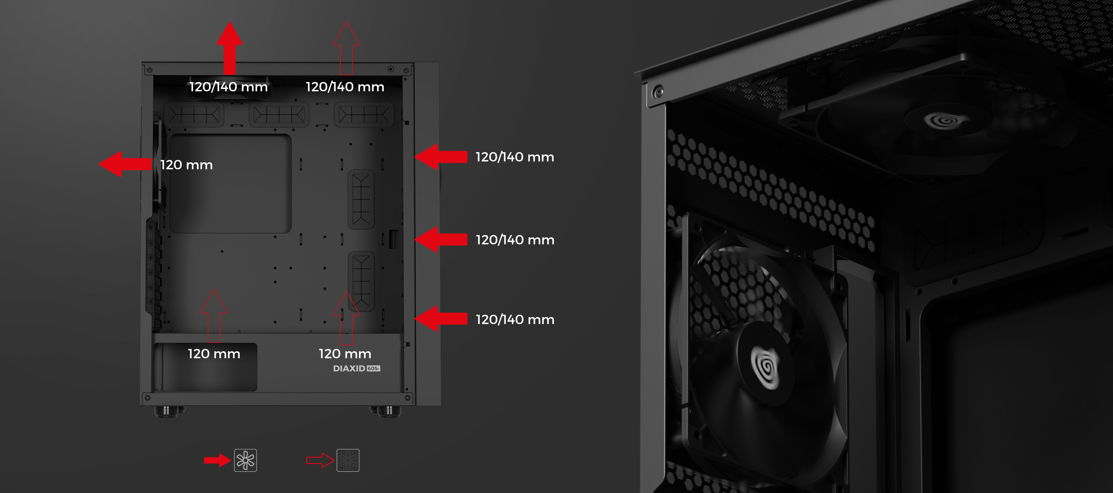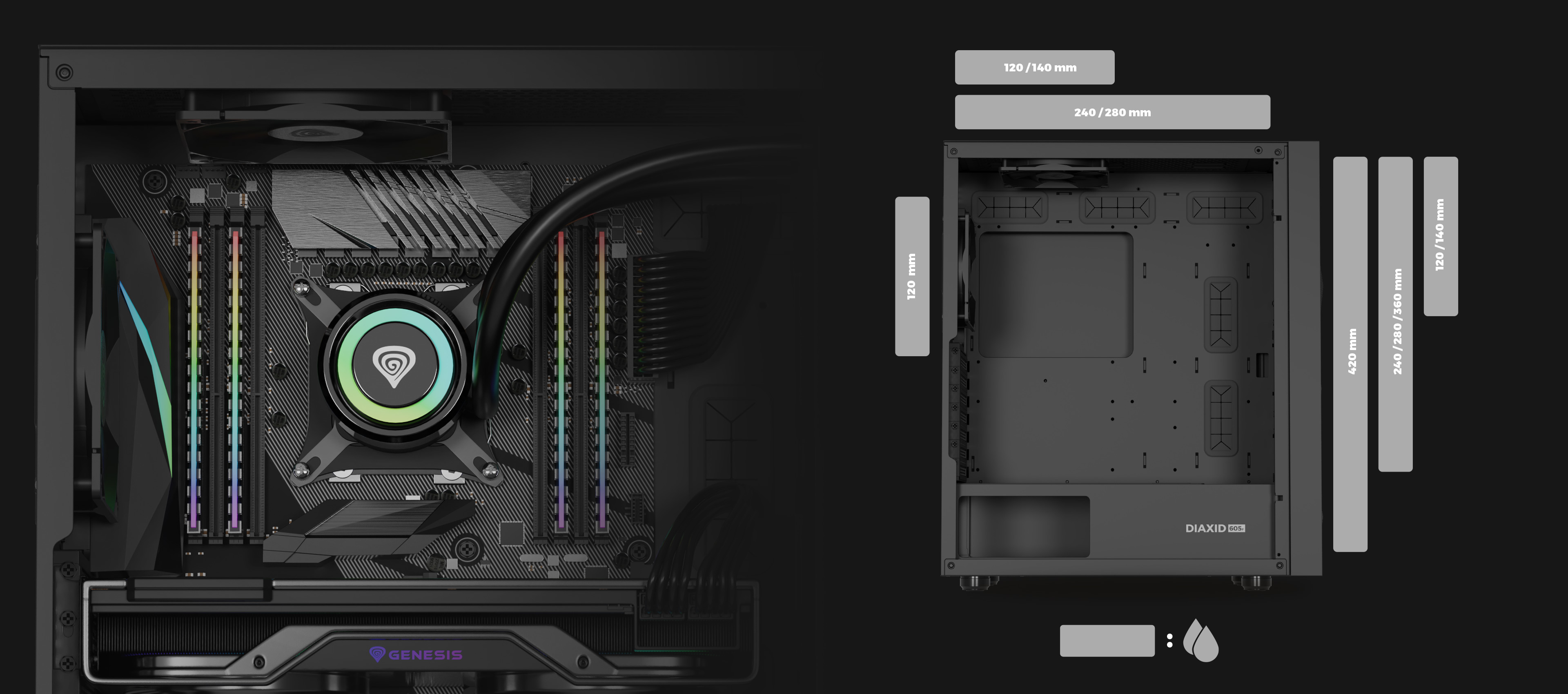 Hledáte skříň, která vám poskytne plnou svobodu při montáži jednodílného vodního chlazení? S GENESIS Diaxid 605F uvidíte, jak je to snadné. Přední část skříně vám umožní namontovat sestavy AIO 420/360/280/240/120 (včetně chladiče o tloušťce až ~27 mm na přední straně v případě AIO 420). Na horní straně zase můžete počítat s montáží AIO 280 se standardním chladičem (~27 mm) nebo "tlustší" AIO 240/140/120 (s chladičem ~38 mm). Také zadní strana vám umožní jednoduše a rychle namontovat klasický AIO 120.
