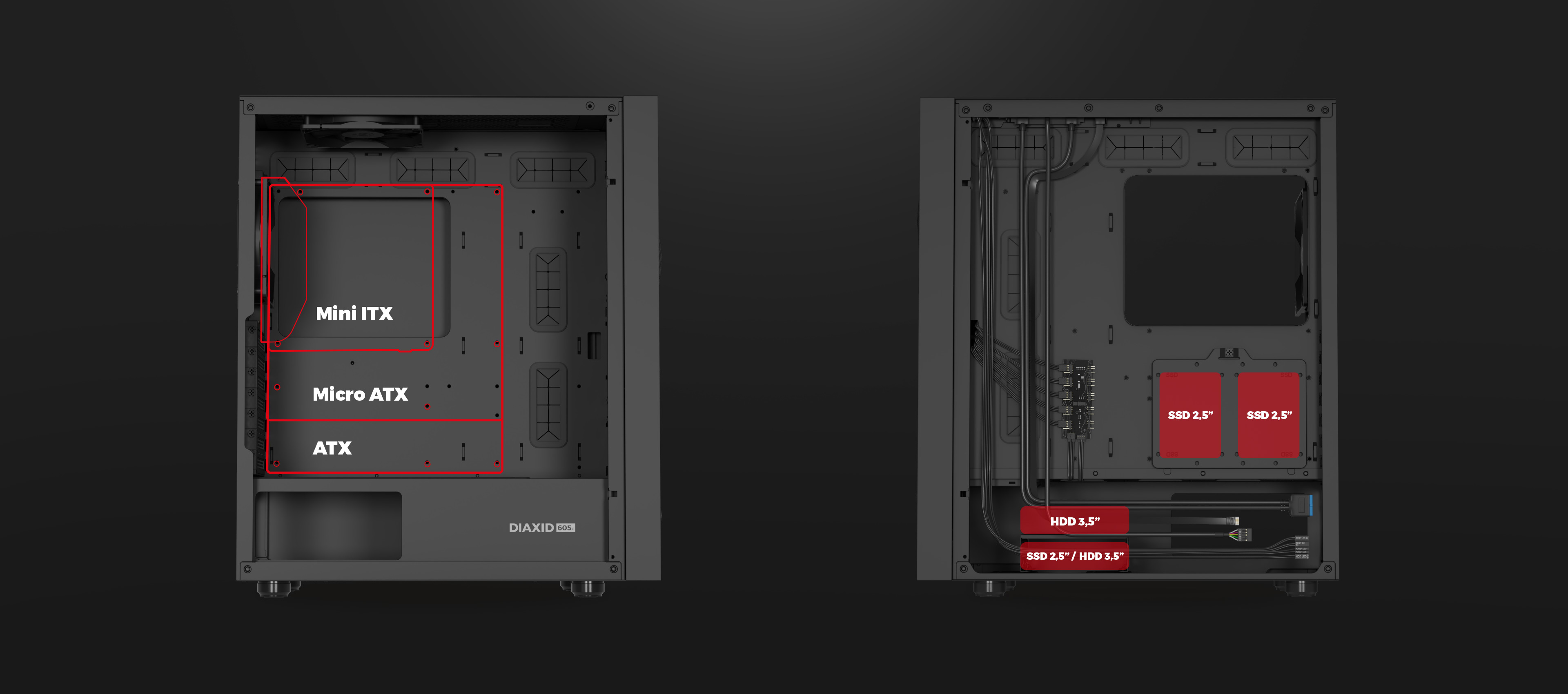 GENESIS Diaxid 605F je model, který jsme vytvořili s ohledem na možnost stavět vysoce výkonné jednotky. To znamená nejen vynikající chladicí vlastnosti, ale také možnost promyšlené montáže komponent. Kompatibilita s deskami ATX, microATX, mini-ITX, 2 sloty pro 2,5" SSD média, 1 slot pro 3,5" HDD a 1 hybridní slot 2,5"/3,5". Navíc grafické karty s maximální délkou ~351 mm a věžové chladiče s výškou ~168 mm. Vsaďte na skříň, která splní vaše očekávání.