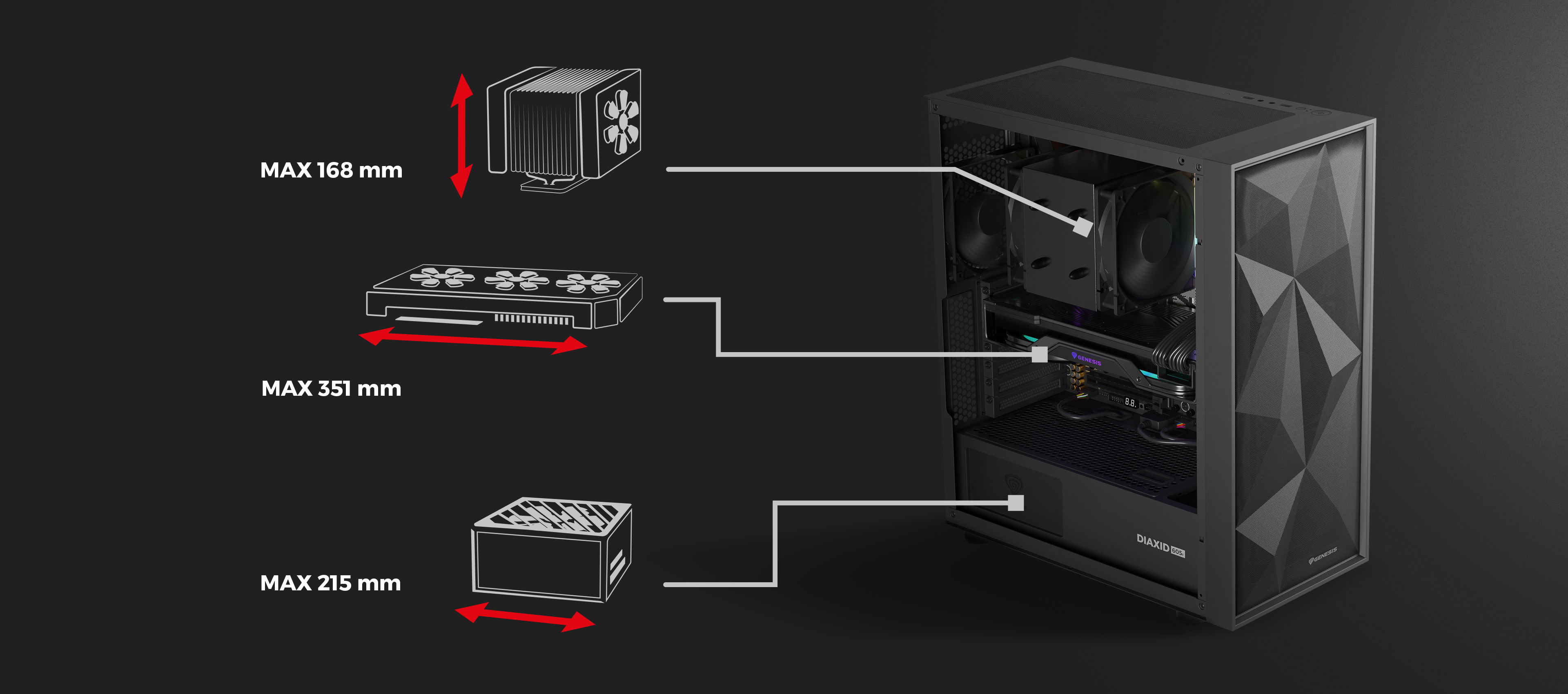 - Dostatek prostoru pro montáž dlouhých grafických karet až do 351 mm a vysokého vzduchového chlazení procesoru až 168 mm.