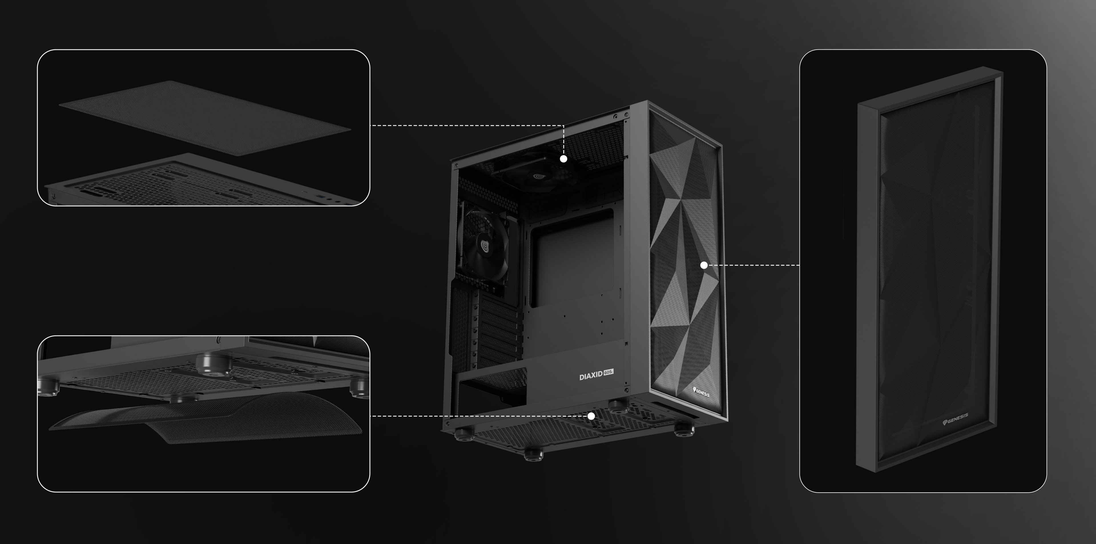 S GENESIS Diaxid 605F se nemusíte obávat prachu. Magnetické filtry umístěné na horní a spodní straně skříně před ním ochrání vaše komponenty. V případě potřeby je můžete snadno otřít vlhkým hadříkem, čímž se nečistot zbavíte během několika sekund. Celé to doplňuje přední síťový panel, jehož oka jsou menší (~0,8 mm) než u standardních filtrů. Větší hustota znamená výhodu lepších filtračních vlastností a menšího množství prachu uvnitř.