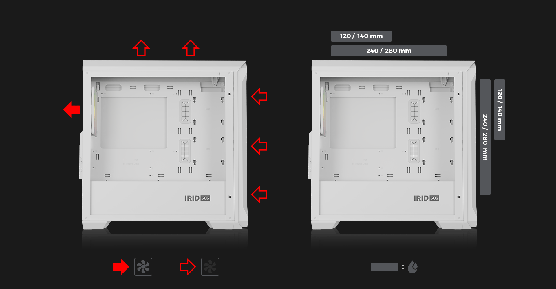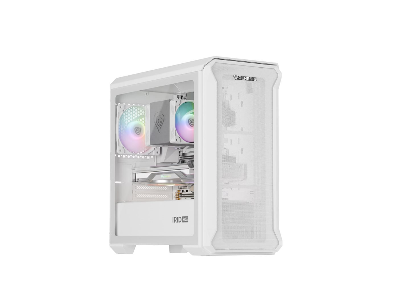 Genesis Irid 503 ARGB LITE umoĹľĹuje montáž diskĹŻ v konfiguraci 3 Ă— 2,5" a 1 Ă— 3,5" nebo 2 Ă— 2,5" a 2 Ă— 3,5". ZaruÄŤuje takĂ© kompatibilitu se základnĂmi deskami Mini-ITX a Micro-ATX a nabĂzà širokĂ˝ vĂ˝bÄ›r komponent.