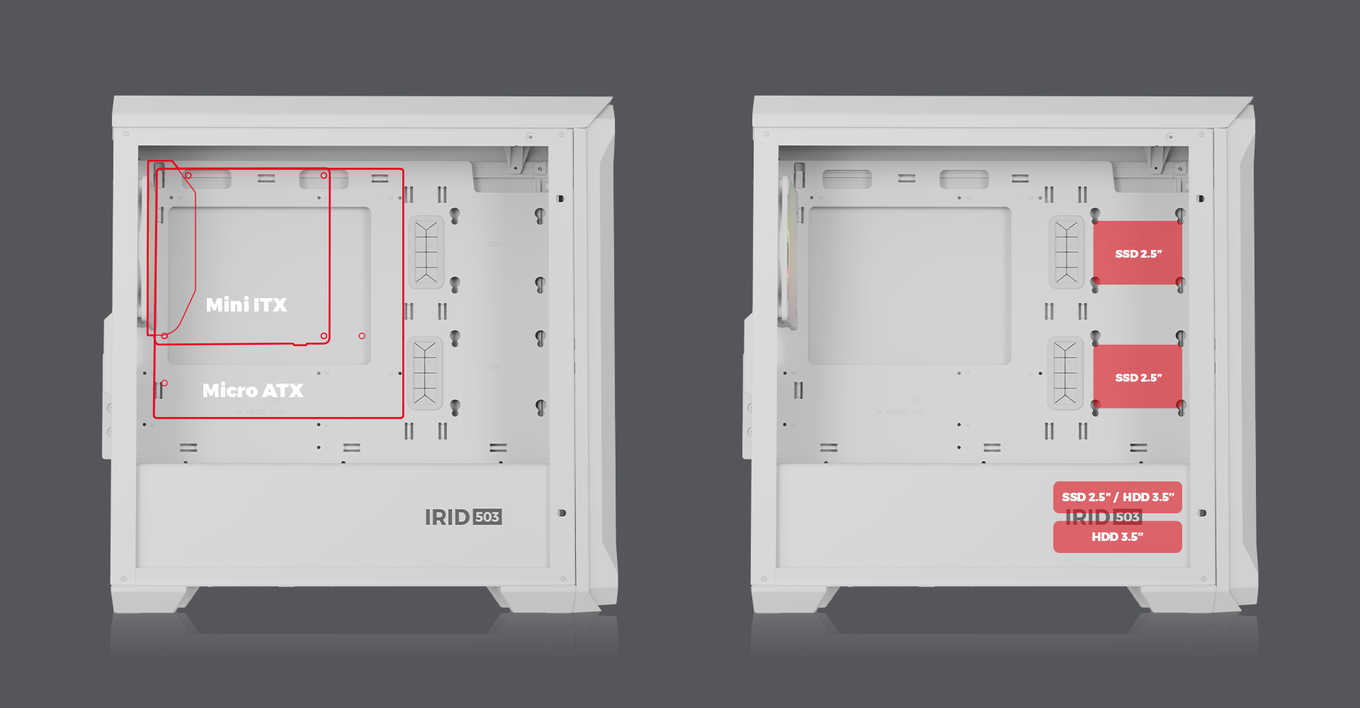 Genesis Irid 503 ARGB LITE umožňuje montáž disků v konfiguraci 3 × 2,5" a 1 × 3,5" nebo 2 × 2,5" a 2 × 3,5". Zaručuje také kompatibilitu se základními deskami Mini-ITX a Micro-ATX a nabízí široký výběr komponent.