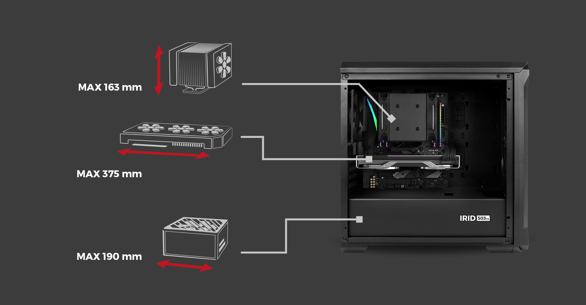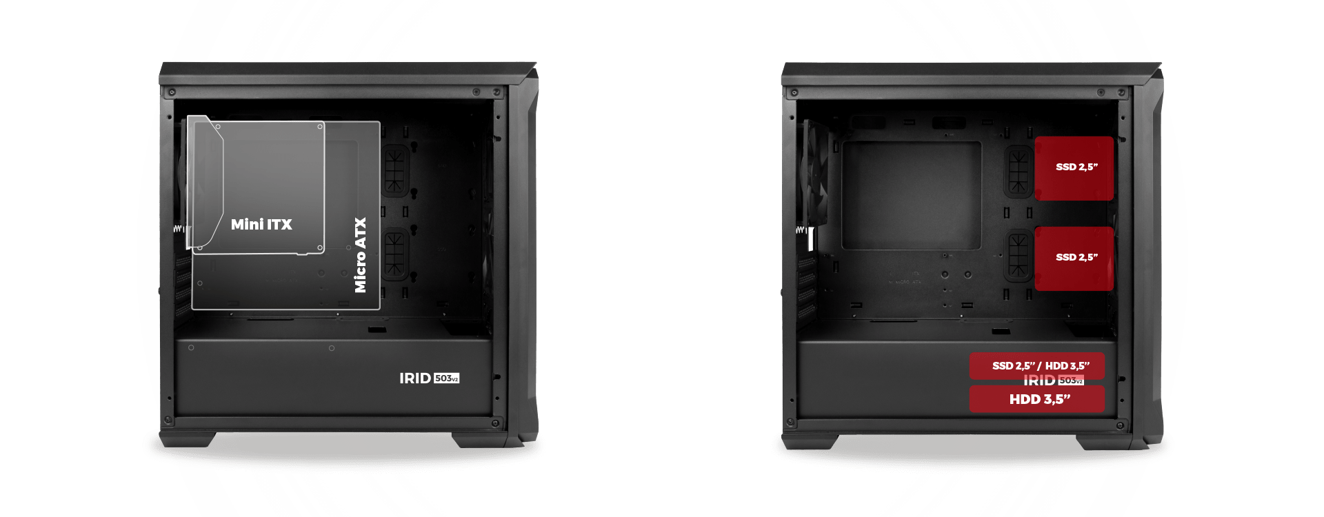 Seznamte se s Irid 503 V2! Před vámi je počítačová skříň typu micro tower malých rozměrů se skvělou funkčností. Byla vyrobena z pevných materiálů, které vám umožní efektivní práci po mnoho let.