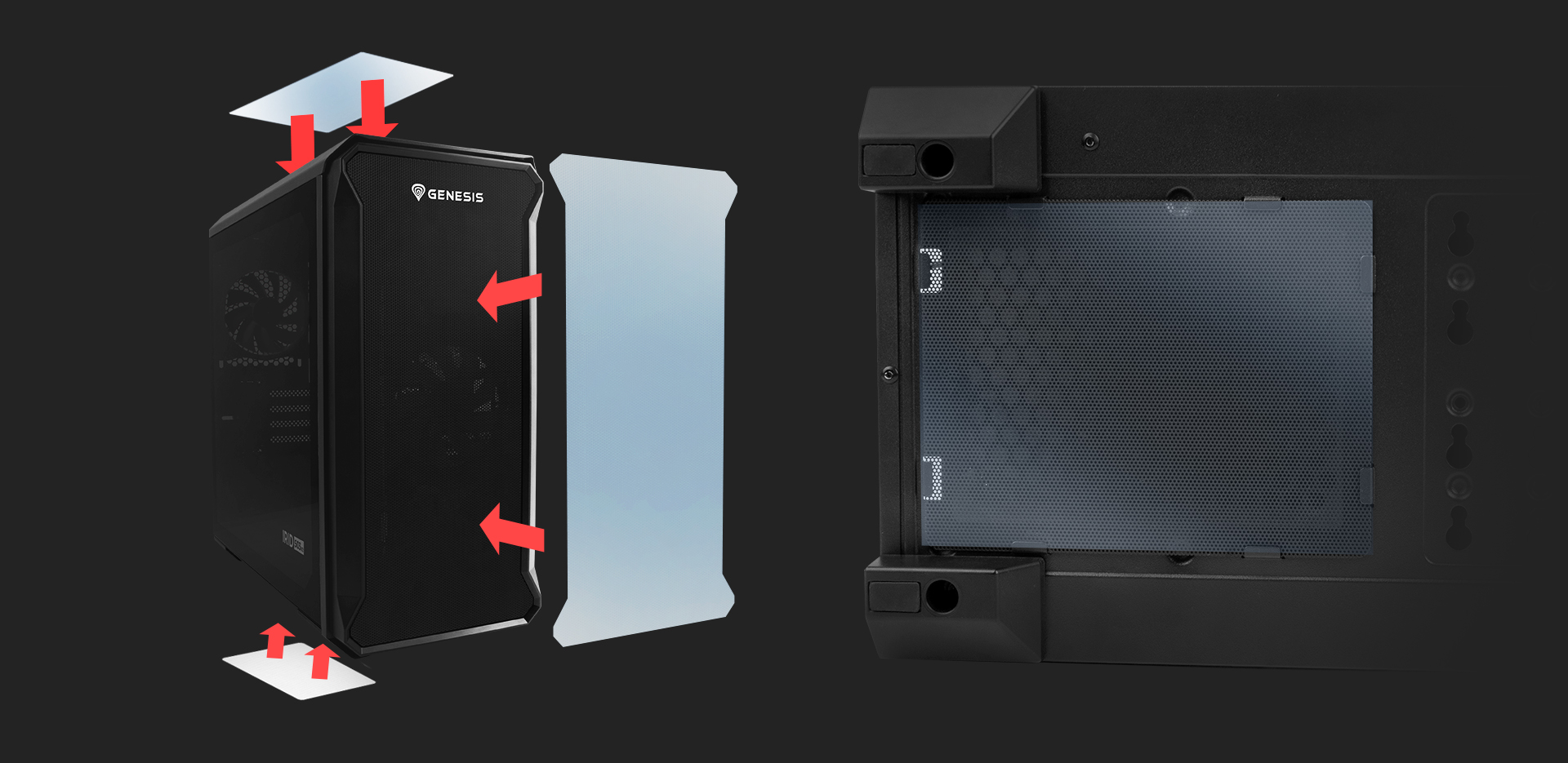 Bojujete nerovný boj s prachem, který se dostává dovnitř? Genesis Irid 503 V2 je kryt, u kterého jsou oka přední síťky menší (<0,8 mm) než u standardních filtrů. Větší hustota znamená výhody lepších filtračních vlastností a menšího množství prachu uvnitř. Můžete jej snadno vyčistit jednoduchým hadříkem, a to vše bez nutnosti sejmutí předního panelu. Kromě toho najdete ve skříni další dva prachové filtry (na horní a spodní straně), které lze snadno vyjmout. To vám umožní udržovat pořádek, který vám už dlouho nedává spát.